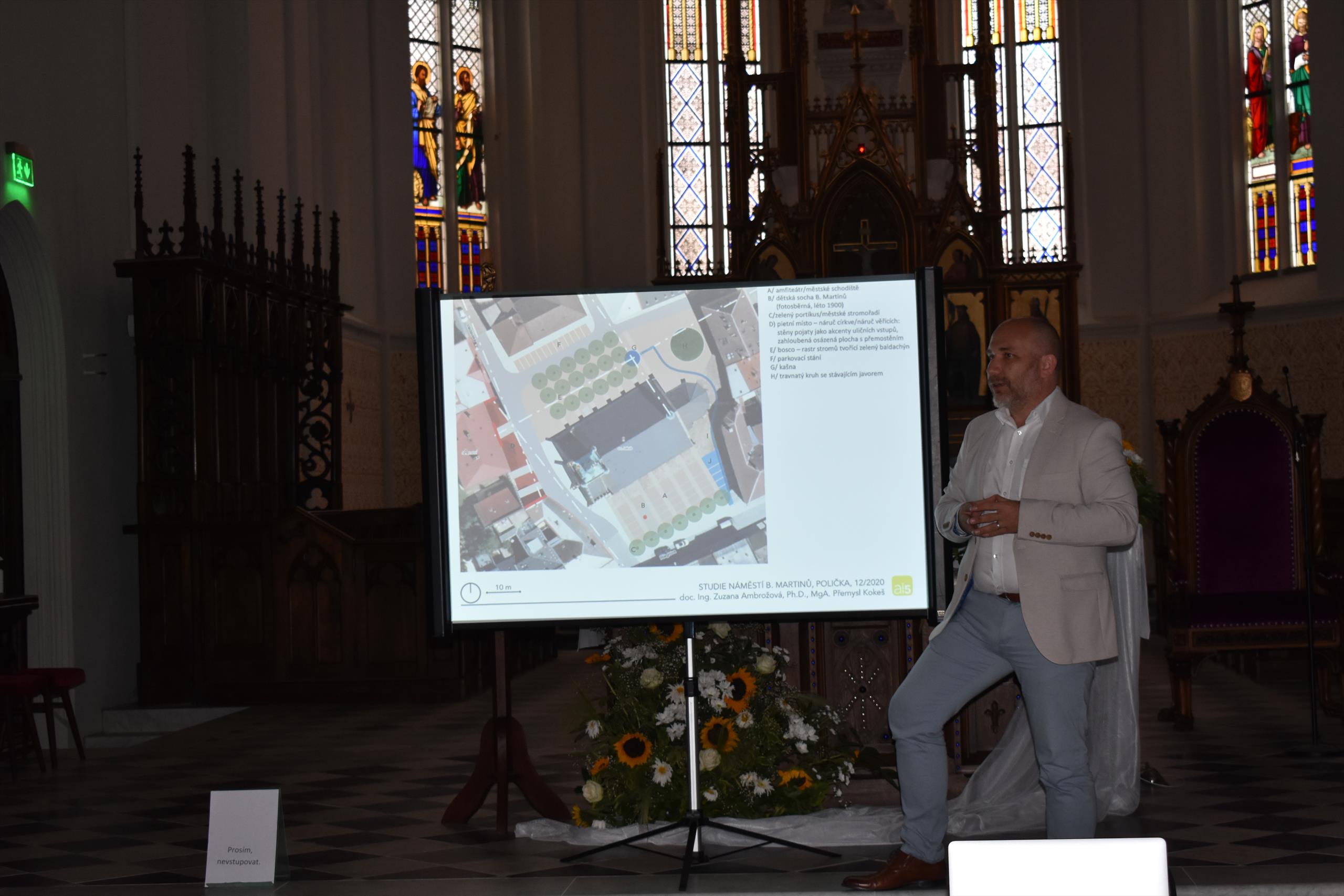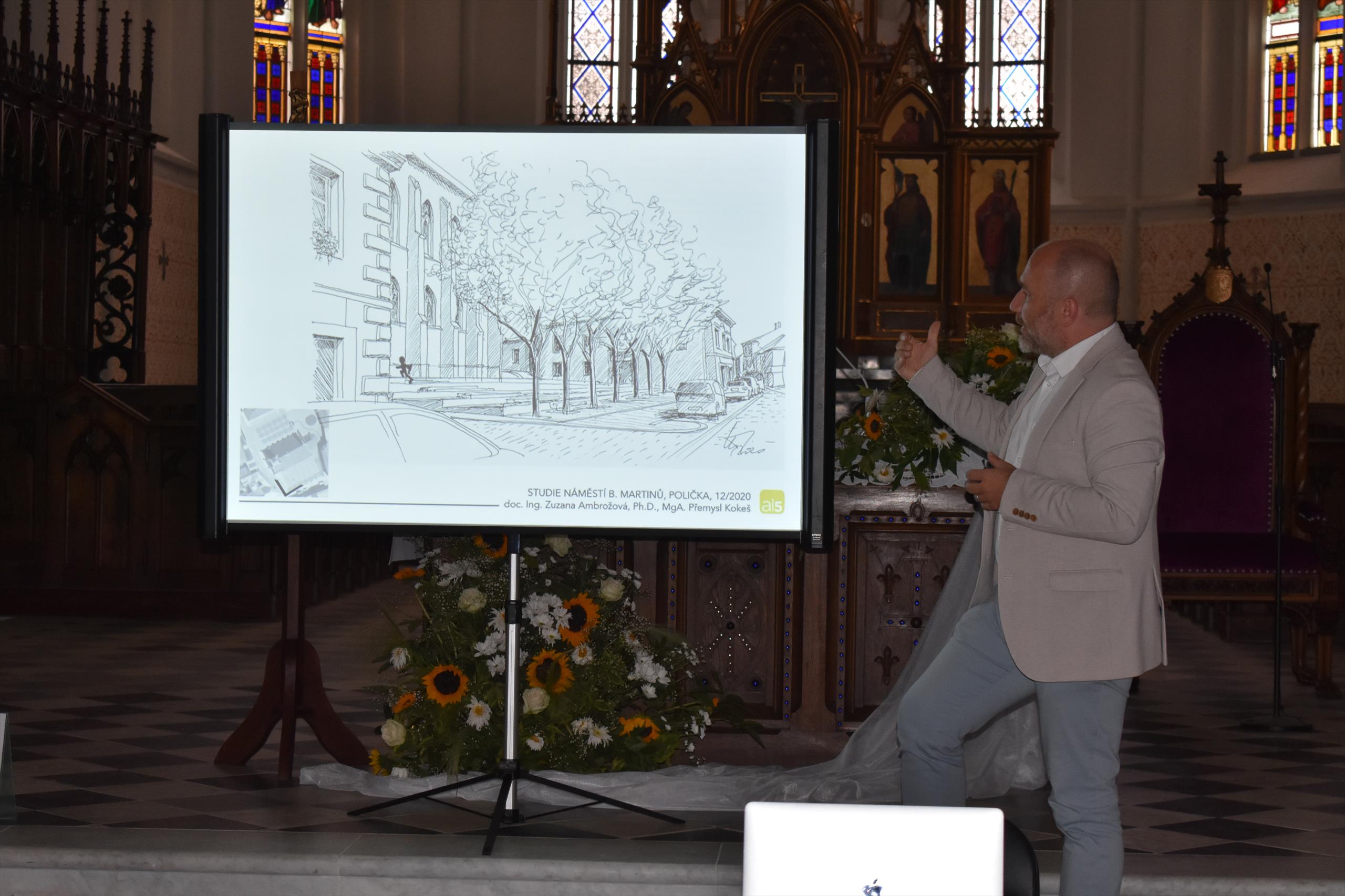 Studii představil veřejnosti MgA. Přemysl Kokeš na besedě, kterou uspořádalo město Polička ve středu 21. července. Pan architekt nejprve přítomným v interiéru kostela sv. Jakuba promítnul a okomentoval celý projekt a poté pokračoval výklad a také zodpovězení řady dotazů přímo v terénu.