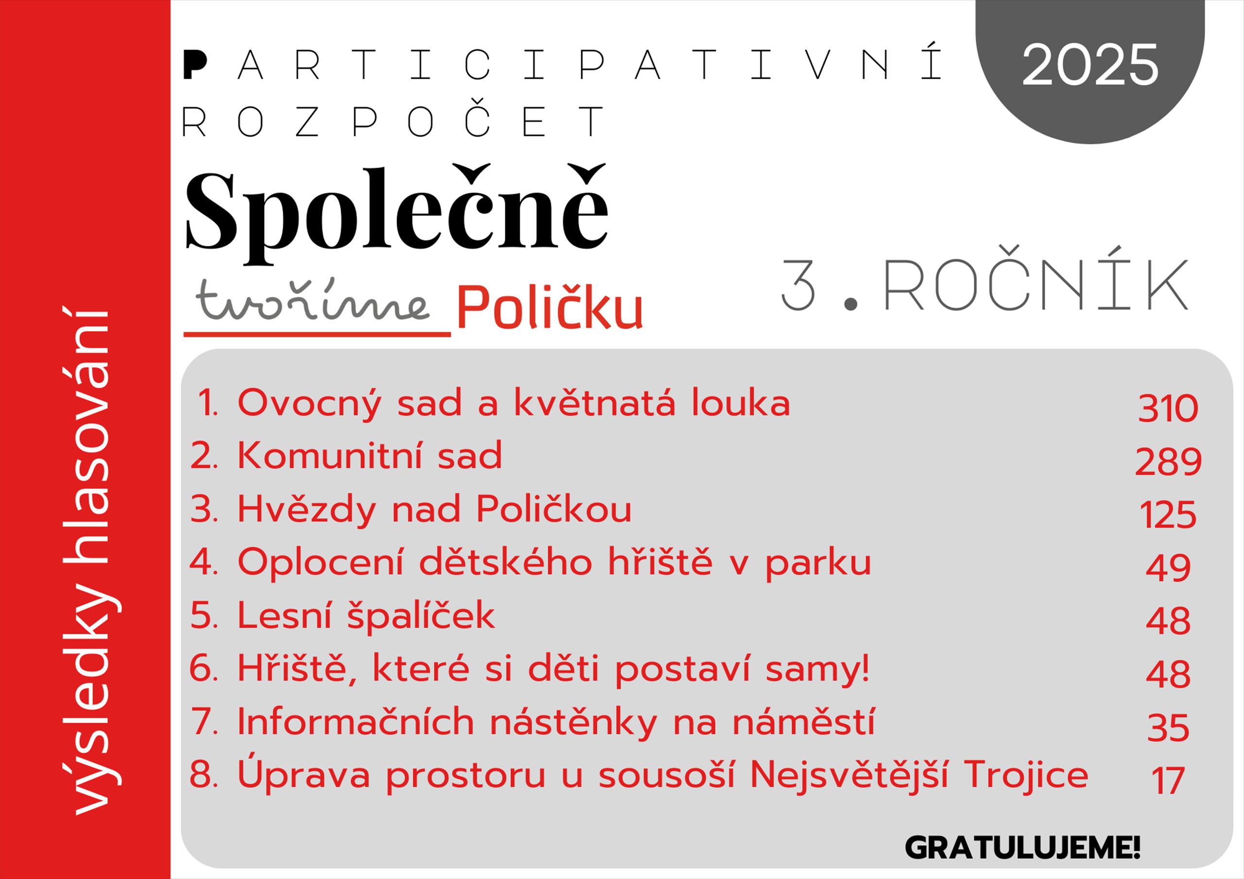 Ve třetím ročníku participativního rozpočtu bylo podáno 9 zajímavých návrhů. Po projednání projektů pracovní skupinou pro participaci a konzultacích s úředníky, odborníky a navrhovateli jich bylo zařazeno do hlasování 8.