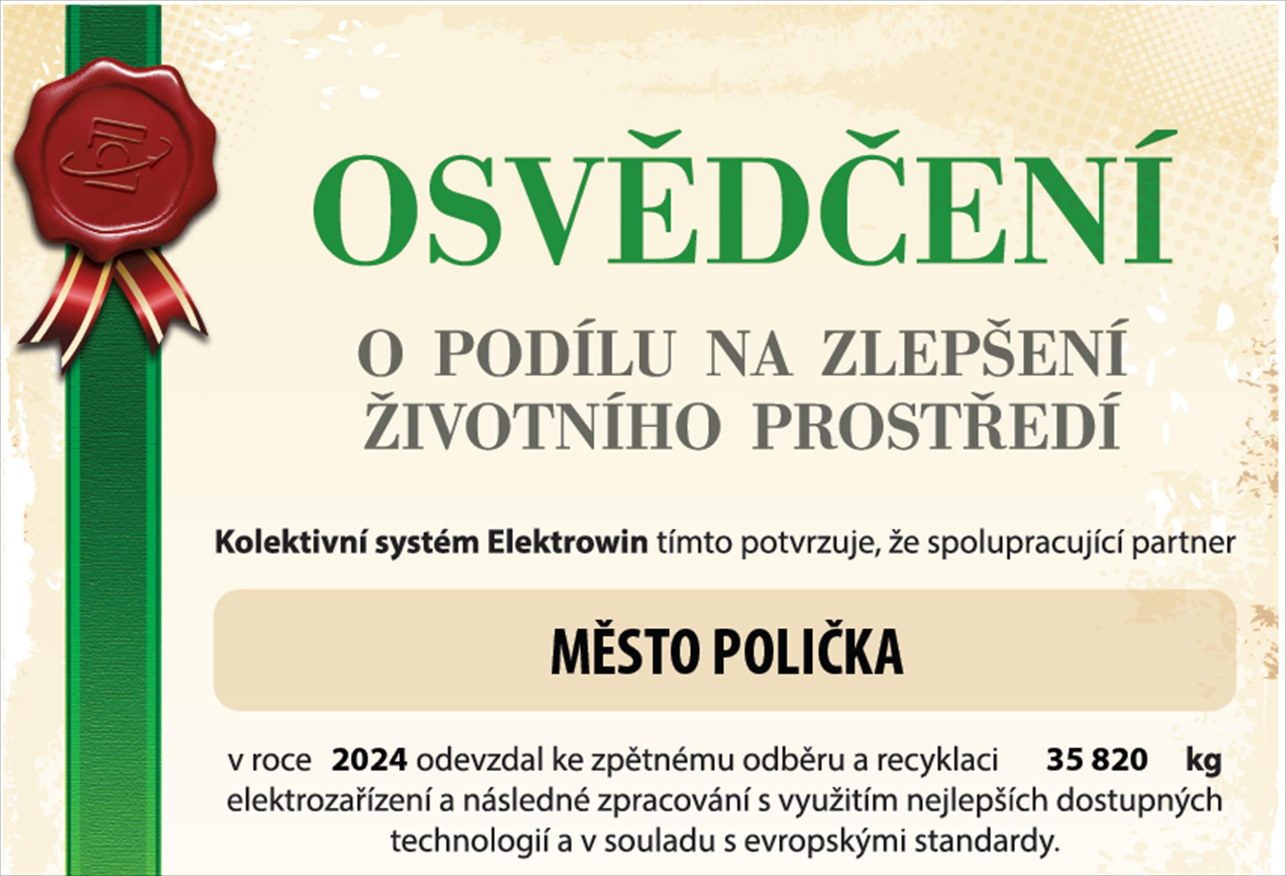 Také společnost ELEKTROWIN a.s. která zajišťuje na území města sběr a svoz vysloužilých elektrozařízení, nám zaslala osvědčení o podílu na zlepšení životního prostředí a o zpětném odběru a recyklaci elektrozařízení za rok 2024.