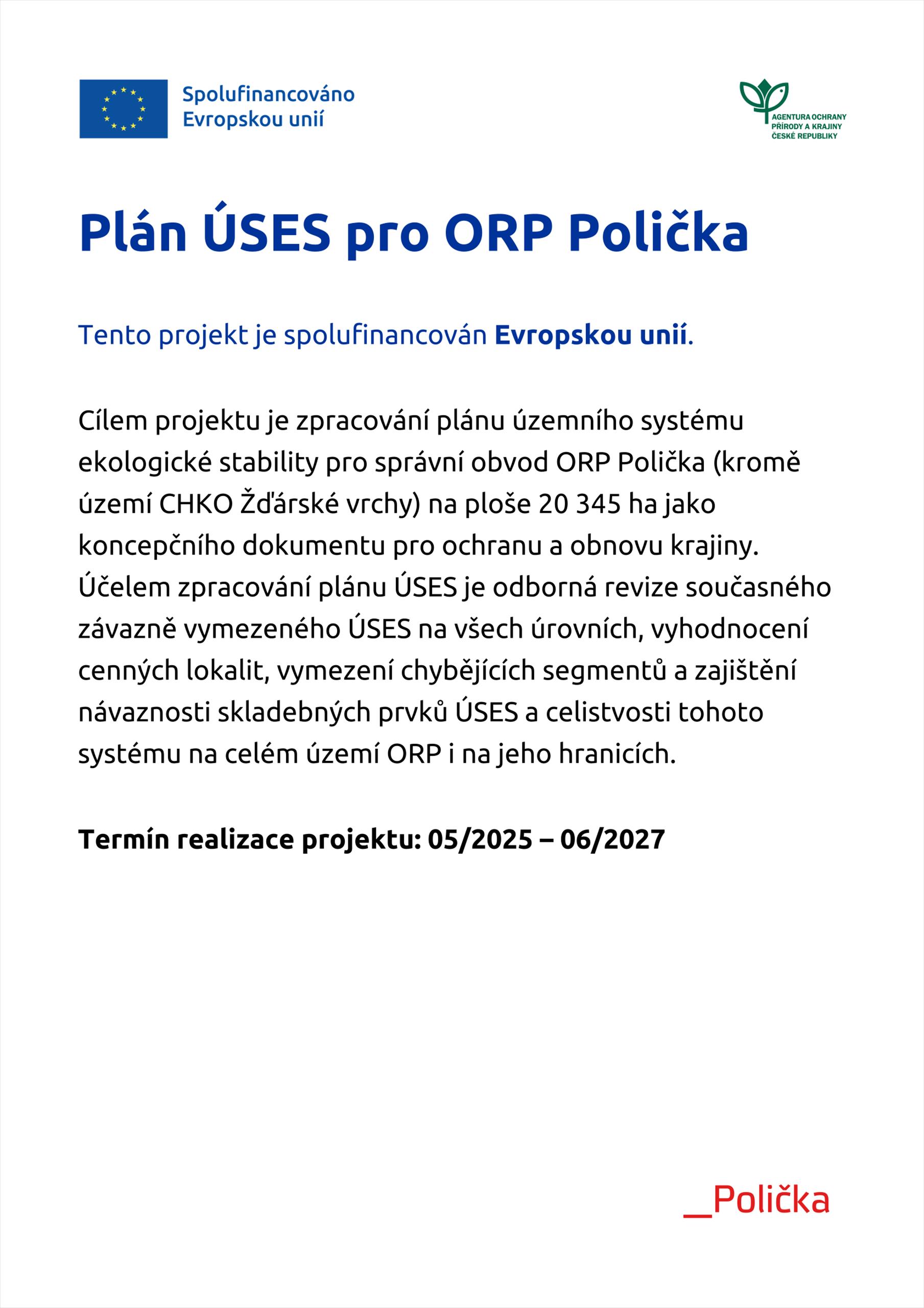 Cílem plánu územního systému ekologické stability je odborná revize současného závazně vymezeného ÚSES místní úrovně v územních plánech, regionální a nadregionální úrovně v zásadách územního rozvoje Pardubického kraje a zajištění návaznosti skladebných prvků ÚSES uvnitř a na hranicích území ORP Polička, zajištění celistvosti tohoto systému, vymezení chybějících segmentů skladebných prvků ÚSES na území ORP Polička a zapracování interakčních prvků. Dokumentace bude zpracována pro území správního obvodu ORP Polička (kromě území CHKO Žďárské vrchy) na ploše 20 345 ha.