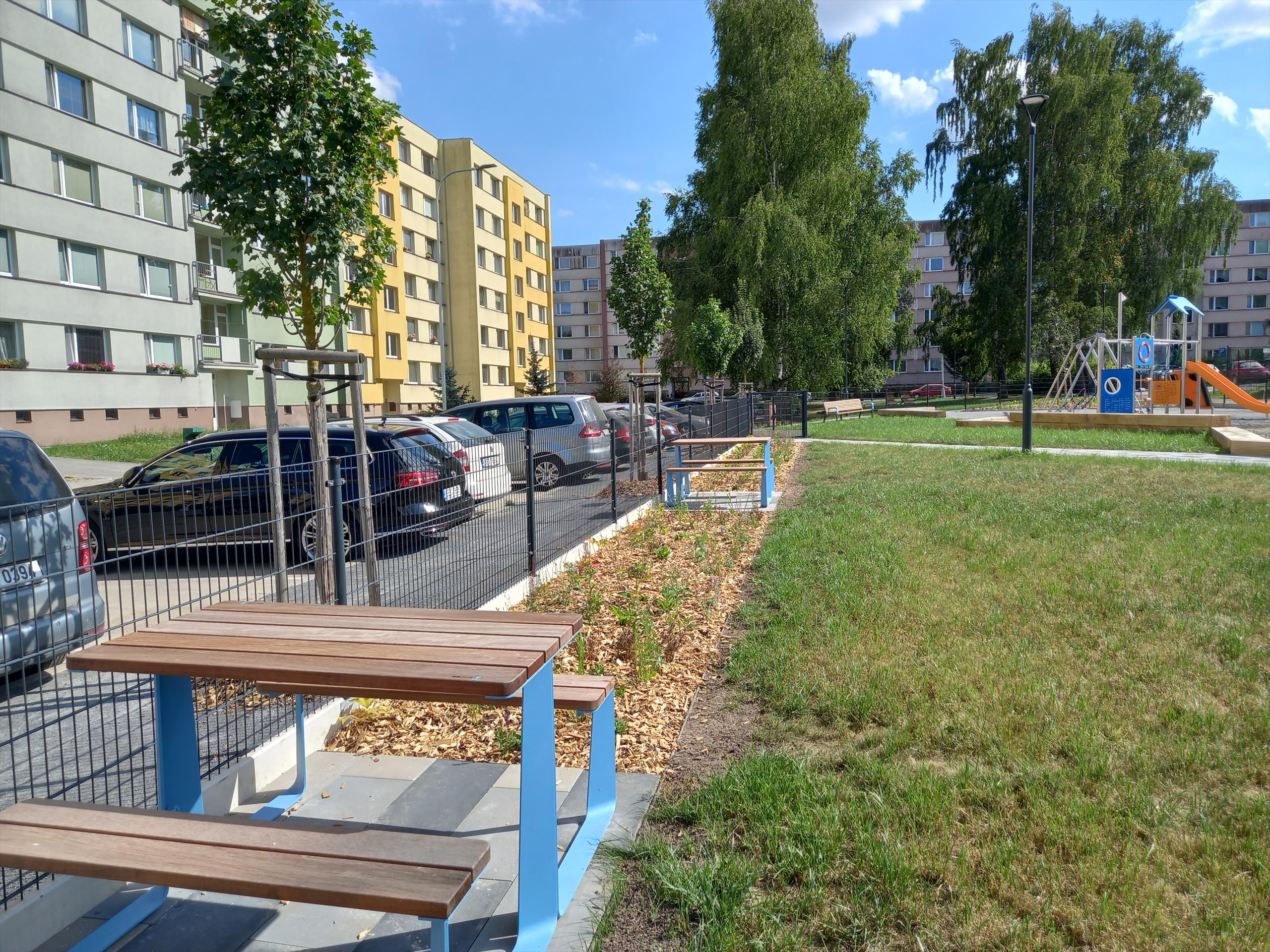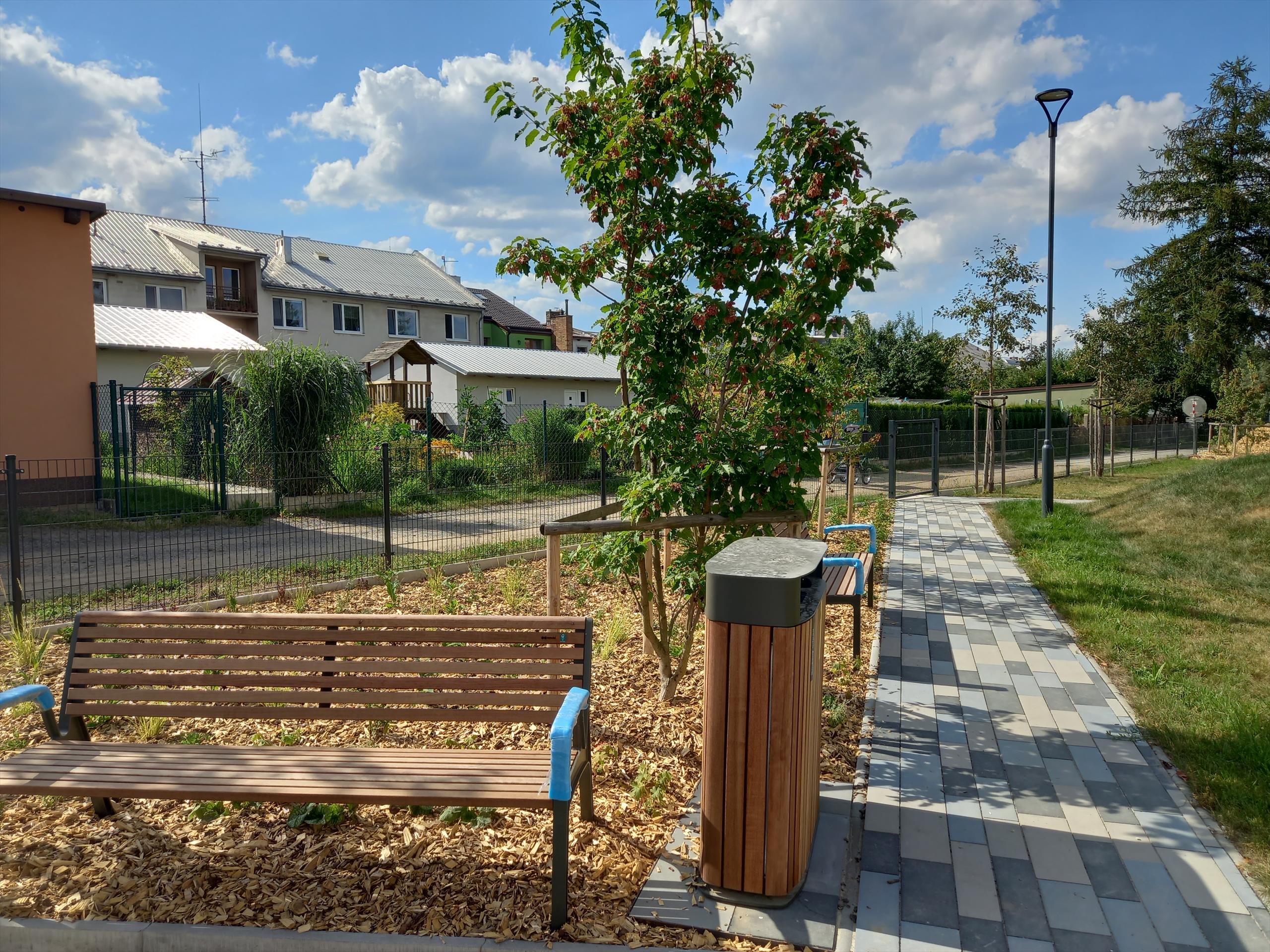 Nové chodníky, veřejné osvětlení a sadové úpravy, mobiliář, moderní dětské hřiště, včetně prolézacího tunelu. Oproti původnímu projektu došlo k několika úpravám i na základě požadavků občanů - výšková úprava terénu, posunutí plotu a vytvoření mlatového chodníčku podél parkoviště namísto kačírku, betonová konstrukce pod umělý povrch dětského hřiště, brána do oplocení pro vjezd techniky údržby. Nový prostor čeká ještě osázení cibulovinami. Termín realizace se posunuje na podzim letošního roku, náklady z městského rozpočtu jsou ve výši cca 6,7 mil. Kč.