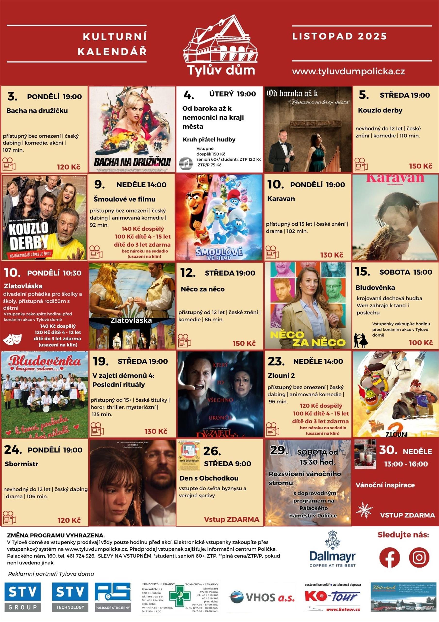 Kompletní program, kulturní kalendář a další informace naleznete na stránkách Tylova domu www.tyluvdumpolicka.cz. a na plakátovacích plochách v Poličce, Svitavách, Litomyšli nebo v Novém Městě na Moravě. Programovou nabídku zveřejňujeme také na sociálních sítích Facebook a Instagram.