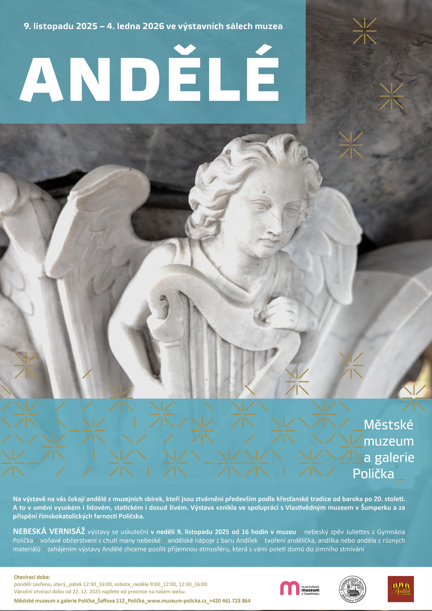 Na výstavě Andělé, která vznikla ve spolupráci s Vlastivědným muzeem v Šumperku a za přispění římskokatolických farností Poličska, na vás čekají andělé z muzejních sbírek, kteří jsou ztvárněni především podle křesťanské tradice od baroka po 20. století. Představí se vám jako adoranti, strážci, přímluvci i poslové boží; v umění vysokém i lidovém, statickém i dosud živém. Výstavu doprovodí množství fotografií, díky nimž nahlédnete mezi duchovní okřídlené bytosti do kostelů Poličska. „Zajímavostí je možnost prohlédnout si nebe s anděly na stropě i v klenbách sálku, které vymalovali dle předlohy malíře Františka Martinů, bratra slavného hudebního skladatele Bohuslava, výtvarníci Lucie Muchovičová a Vojtěch Donát,“ popisuje muzejní nebe kurátorka výstavy etnografka Mgr. Stanislava Cafourková.