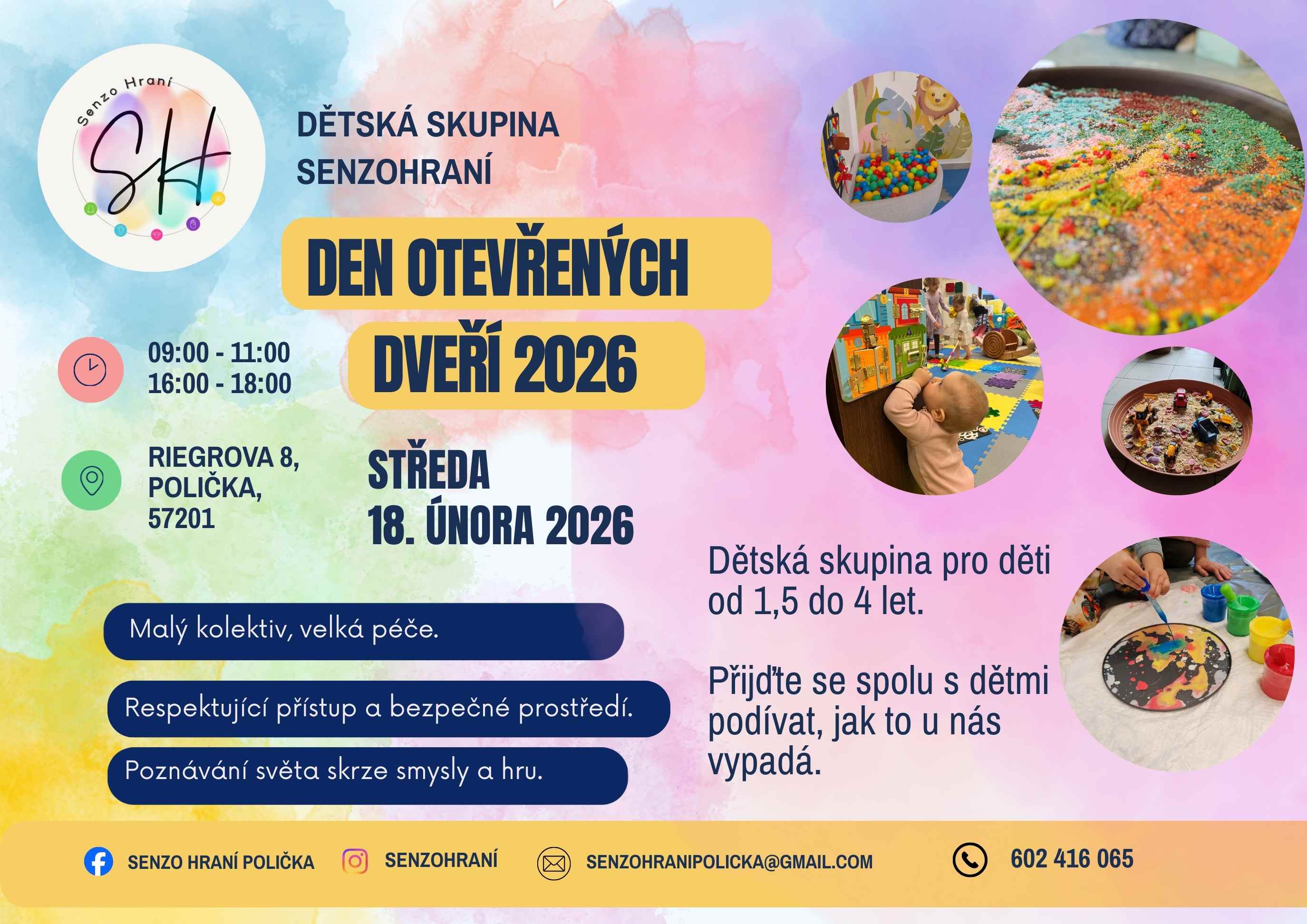 Dětská skupina Senzo Hraní je určena dětem ve věku od 1,5 do 4 let a její kapacita je šest dětí. Skupina bude otevřena každý všední den od 7:00- 15:00. Skupina je skvělou alternativou pro rodiče, kteří se chtějí alespoň částečně vrátit do zaměstnání, než dítě nastoupí do školky.