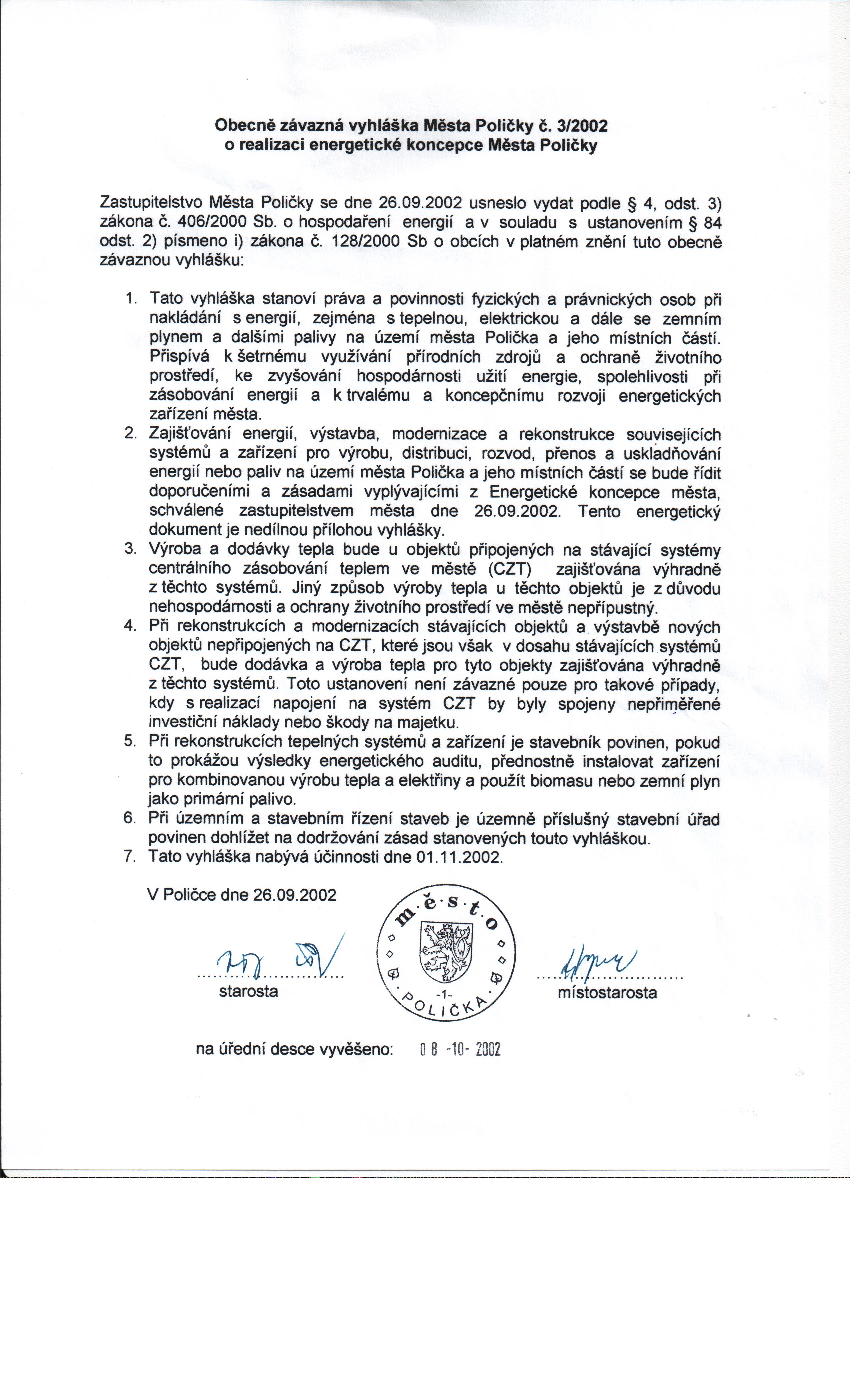 Obecně závazná vyhláška č.3/2002 o realizaci energetické koncepce města Poličky
