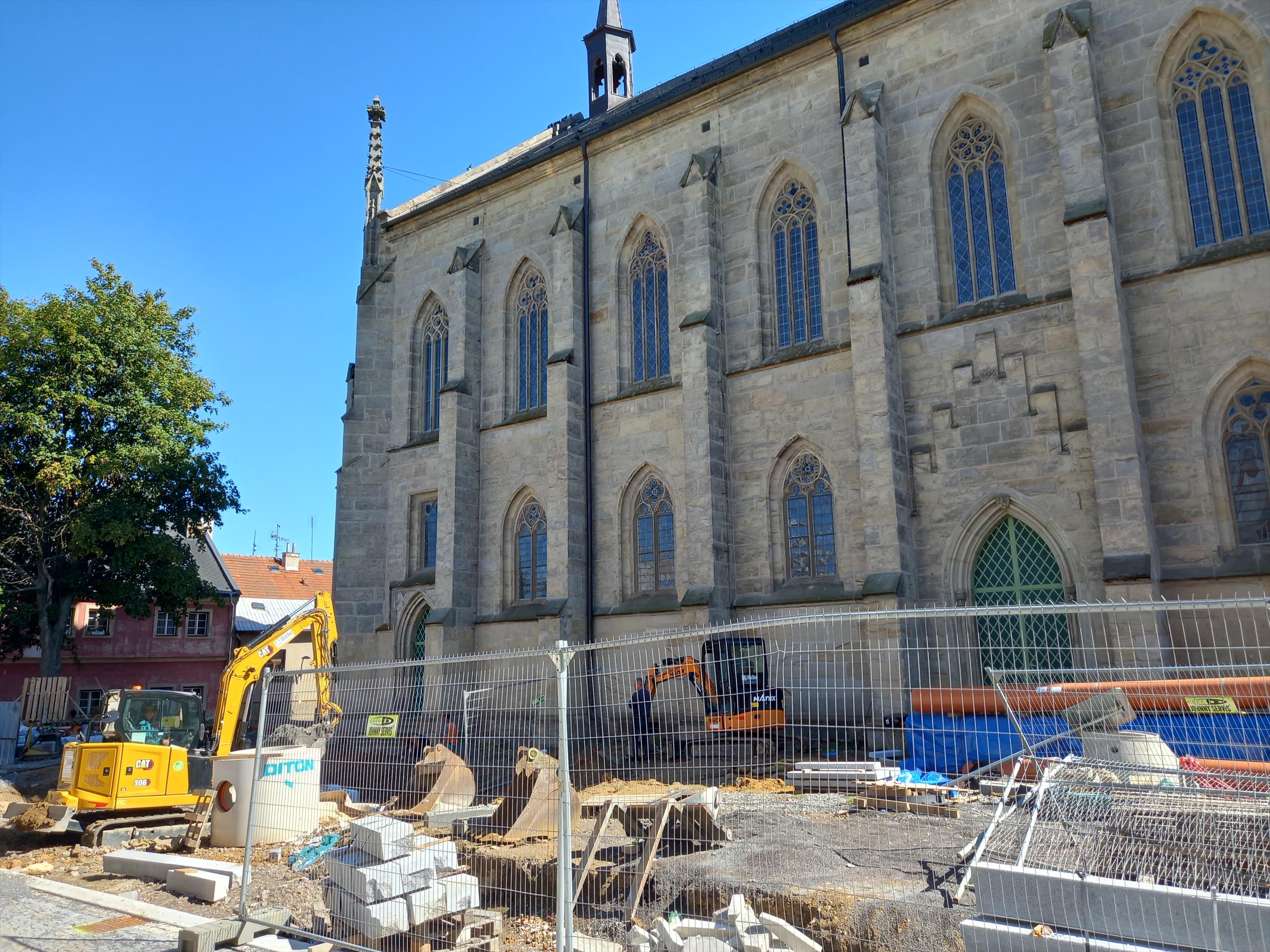 V letních měsících proběhlo osazení retenční nádrže pod kostelem a s tím související práce. Pomocí těžké techniky byla osazena i technická místnost na náměstí B. Martinů (umístění technologie pro funkci budoucí kašny a vodních prvků). Dokončena je komunikace včetně chodníku ze žulových dlažebních kostek a mozaiky z ulice Riegrova do ulice Václavská, osazeny byly i pískovcové kvádry před farou. Zde bude umístěn mostek, který bude bezbariérově spojovat faru s náměstím. V současné době převažuje provádění zemních prací pro inženýrské sítě: budování a překládání kanalizace, vodovodu, elektroinstalace, veřejného osvětlení a realizace speciálního zavlažovací systému. Příští rok bude osazena i kašna, na které probíhají nyní sochařské práce v ateliéru. Dokončena jsou i parkovací stání před Mozaikou. Nutno dodat, že práce probíhají plně v souladu s časovým harmonogramem.