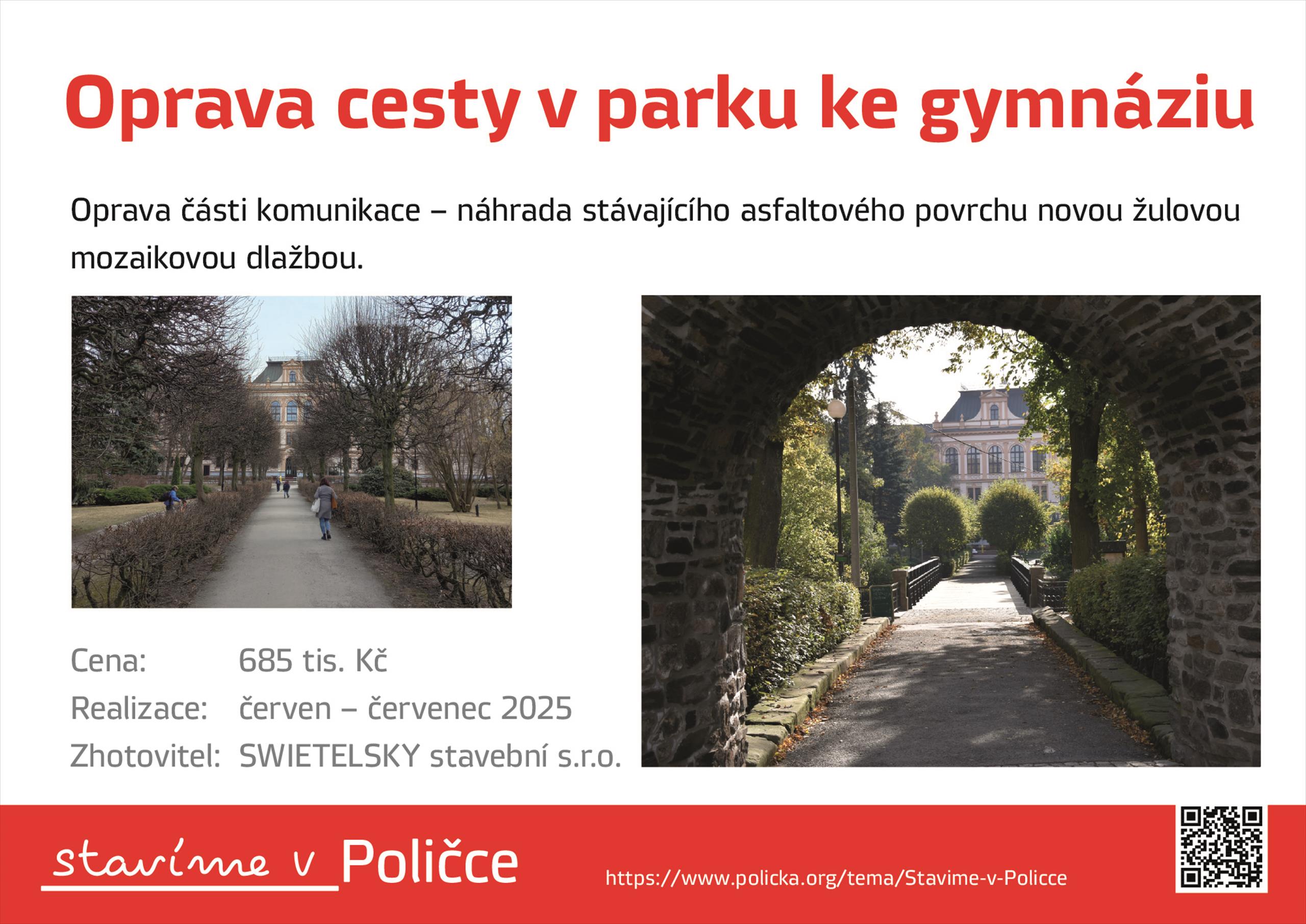 Oprava cesty ke gymnáziu v parku - upozornění
