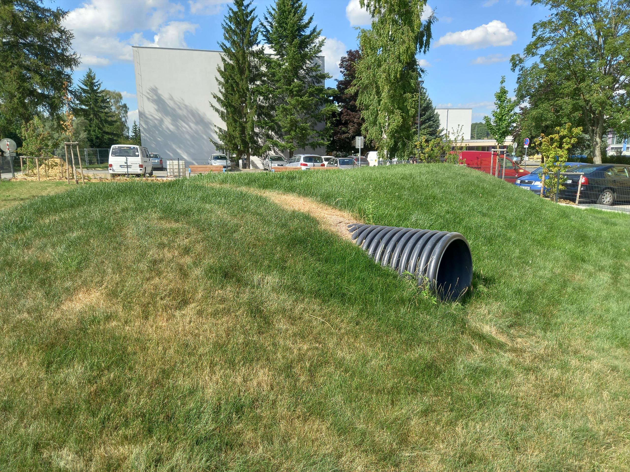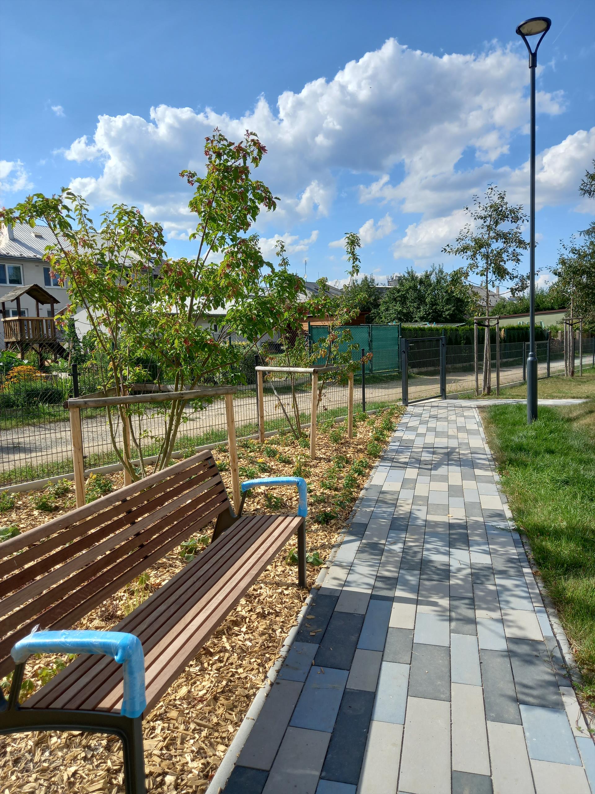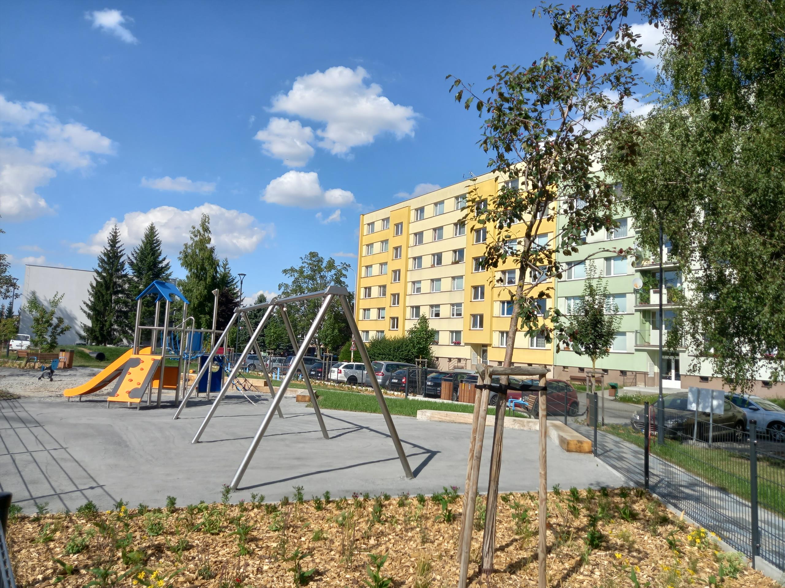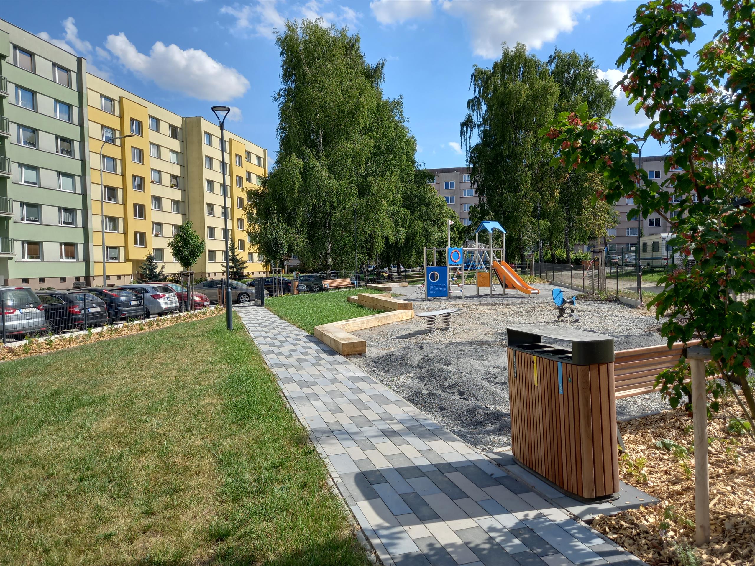 Nové chodníky, veřejné osvětlení a sadové úpravy, mobiliář, moderní dětské hřiště, včetně prolézacího tunelu. Oproti původnímu projektu došlo k několika úpravám i na základě požadavků občanů - výšková úprava terénu, posunutí plotu a vytvoření mlatového chodníčku podél parkoviště namísto kačírku, betonová konstrukce pod umělý povrch dětského hřiště, brána do oplocení pro vjezd techniky údržby. Nový prostor čeká ještě osázení cibulovinami. Termín realizace se posunuje na podzim letošního roku, náklady z městského rozpočtu jsou ve výši cca 6,7 mil. Kč.