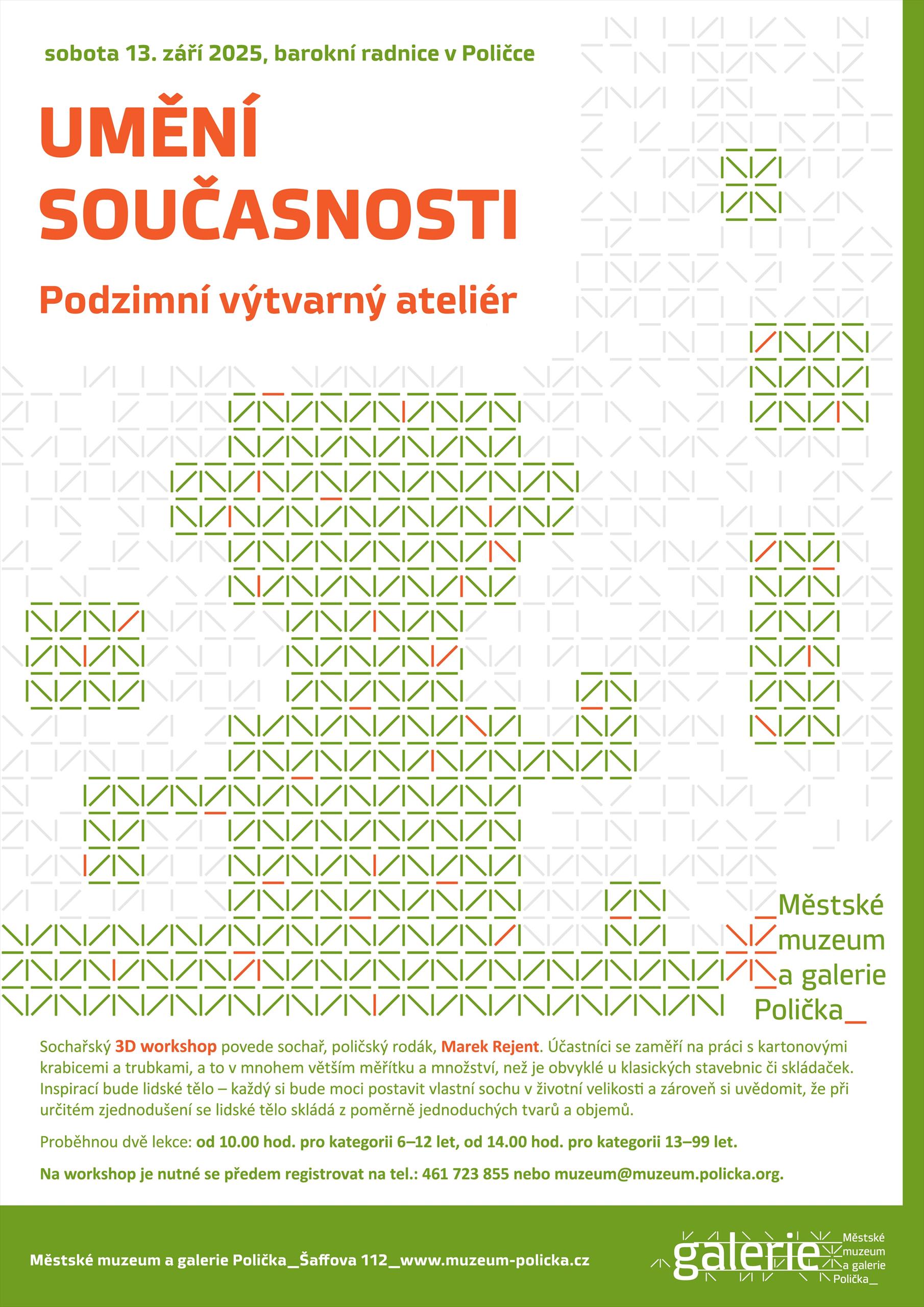 Sochařský 3D workshop povede sochař, poličský rodák, Marek Rejent, který se zaměří na práci s tvary a hmotami, a to v mnohem větším měřítku a množství, než je běžné při použití obvyklých stavebnic a skládaček. Inspirací pro tvorbu bude lidské tělo. Bude možné vytvořit, postavit nebo poskládat vlastní sochu v životní velikosti, a přitom přemýšlet nebo diskutovat o tom, že lidské tělo se při jistém zjednodušení skládá z poměrně jednoduchých tvarů či objemových těles, které jsou v neustále se proměňujících pozicích a polohách. Sestavením těchto typických tvarů můžeme zobrazit určitého člověka, vystihnout jeho charakteristický pohyb, postoj. Je možné postavit fiktivní pomník někomu oblíbenému nebo významnému, jiného naopak ztvárnit s nadsázkou, parodovat. A to vše s bezpečným vědomím, že trvání akce i životnost vzniklých věcí bude časově omezené a nikdo se za pár měsíců nebo let nebude držet za hlavu nad tou podivností, kterou tu kdosi zdánlivě navždy postavil.