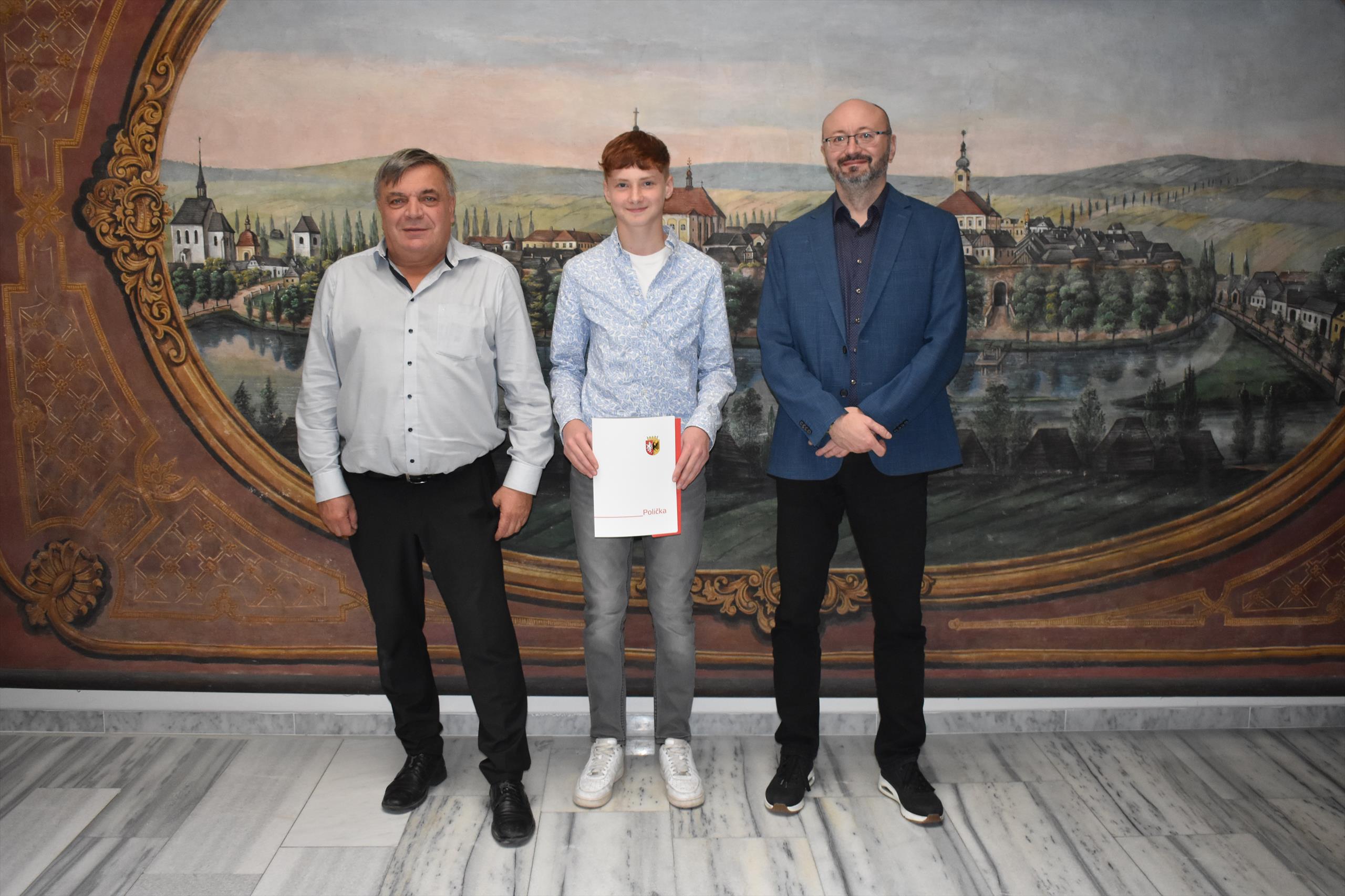 „Jsme na Tebe moc pyšní a velmi si Tvého činu vážíme, myslím, že naši občané by měli takovou dobrou zprávu vědět,“ ocenil Matyáše starosta města Jaroslav Martinů. Ten společně s místostarostou Liborem Jelínkem poděkoval Matyášovi v doprovodu jeho rodičů za statečný čin při osobním setkání. Kromě velkého poděkování obdržel Matyáš šek na výběr odměny dle svého výběru v hodnotě 1000 korun.
