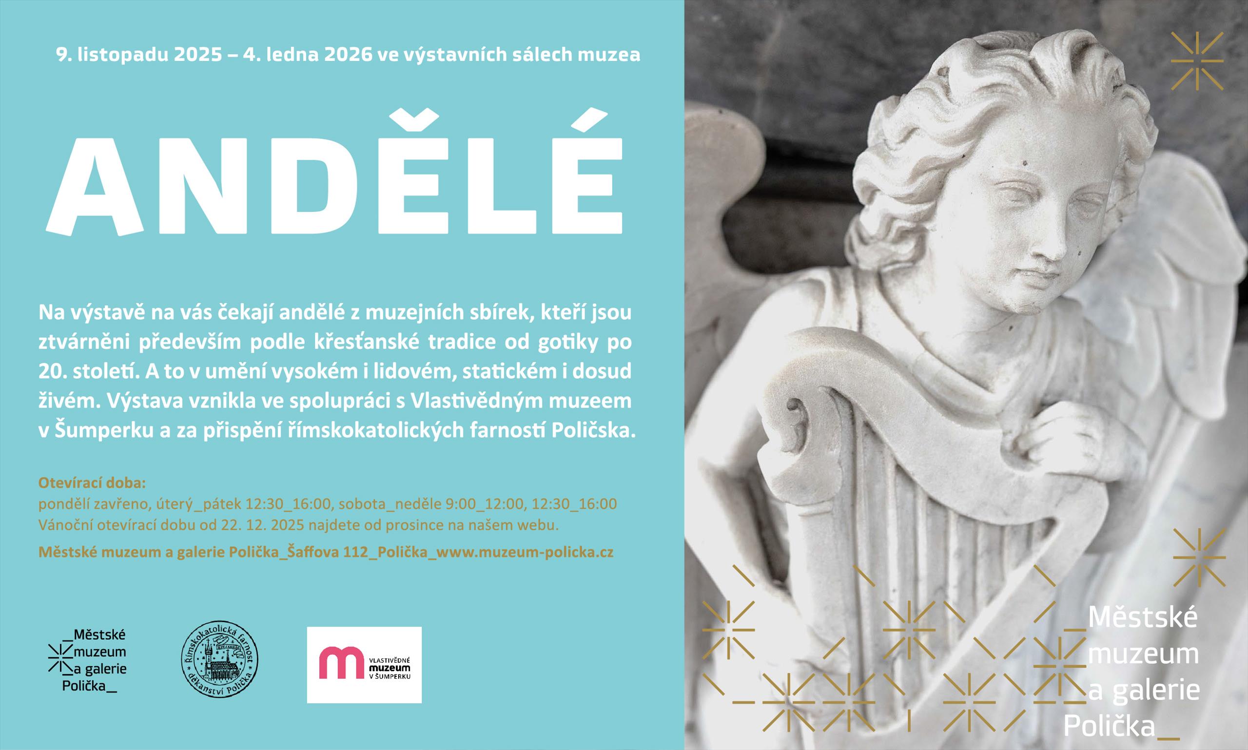 Na výstavě Andělé, která vznikla ve spolupráci s Vlastivědným muzeem v Šumperku a za přispění římskokatolických farností Poličska, na vás čekají andělé z muzejních sbírek, kteří jsou ztvárněni především podle křesťanské tradice od baroka po 20. století. Představí se vám jako adoranti, strážci, přímluvci i poslové boží; v umění vysokém i lidovém, statickém i dosud živém. Výstavu doprovodí množství fotografií, díky nimž nahlédnete mezi duchovní okřídlené bytosti do kostelů Poličska. „Zajímavostí je možnost prohlédnout si nebe s anděly na stropě i v klenbách sálku, které vymalovali dle předlohy malíře Františka Martinů, bratra slavného hudebního skladatele Bohuslava, výtvarníci Lucie Muchovičová a Vojtěch Donát,“ popisuje muzejní nebe kurátorka výstavy etnografka Mgr. Stanislava Cafourková.