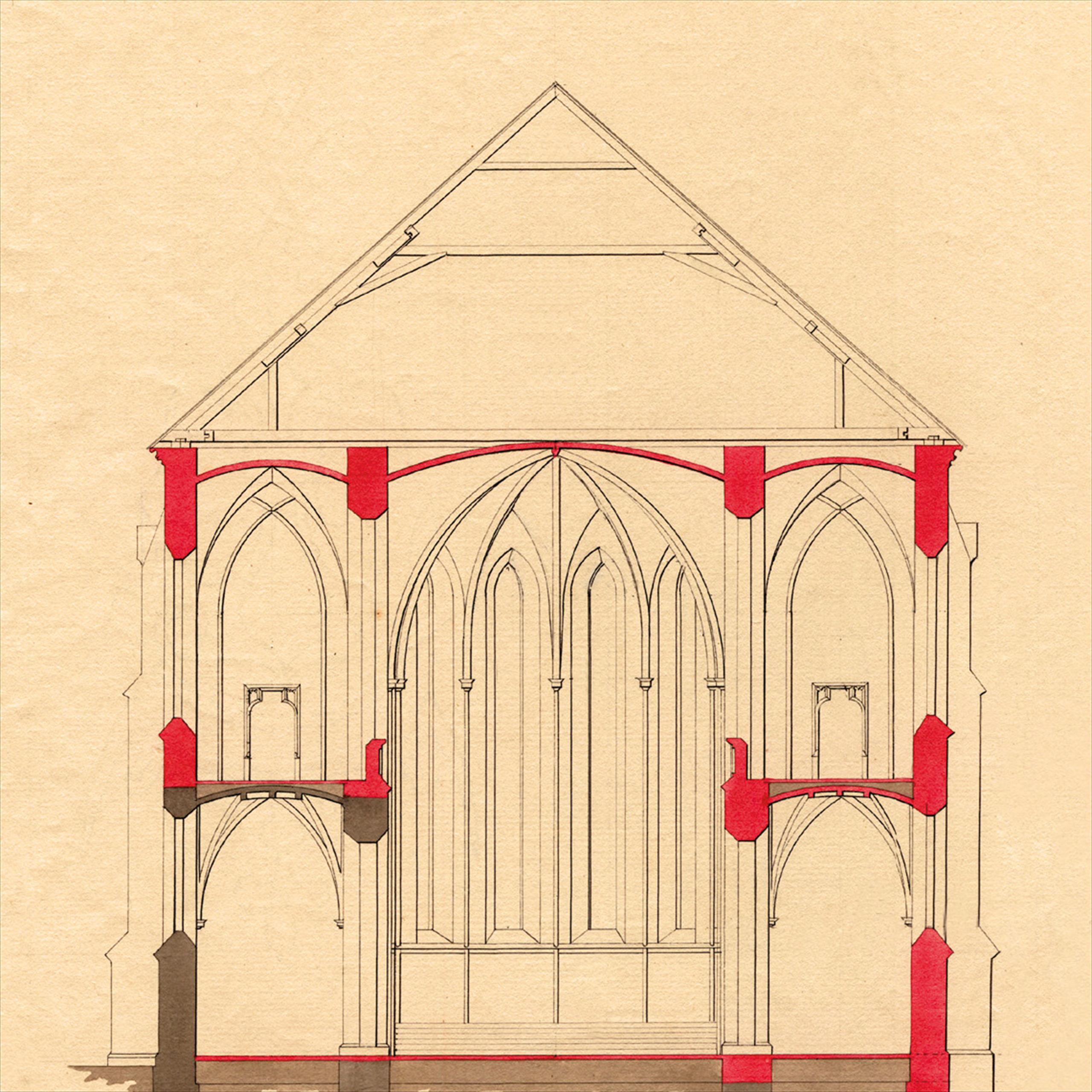 Řez kostelem – novogotická hala (trojlodí se stejně vysokými klenbami