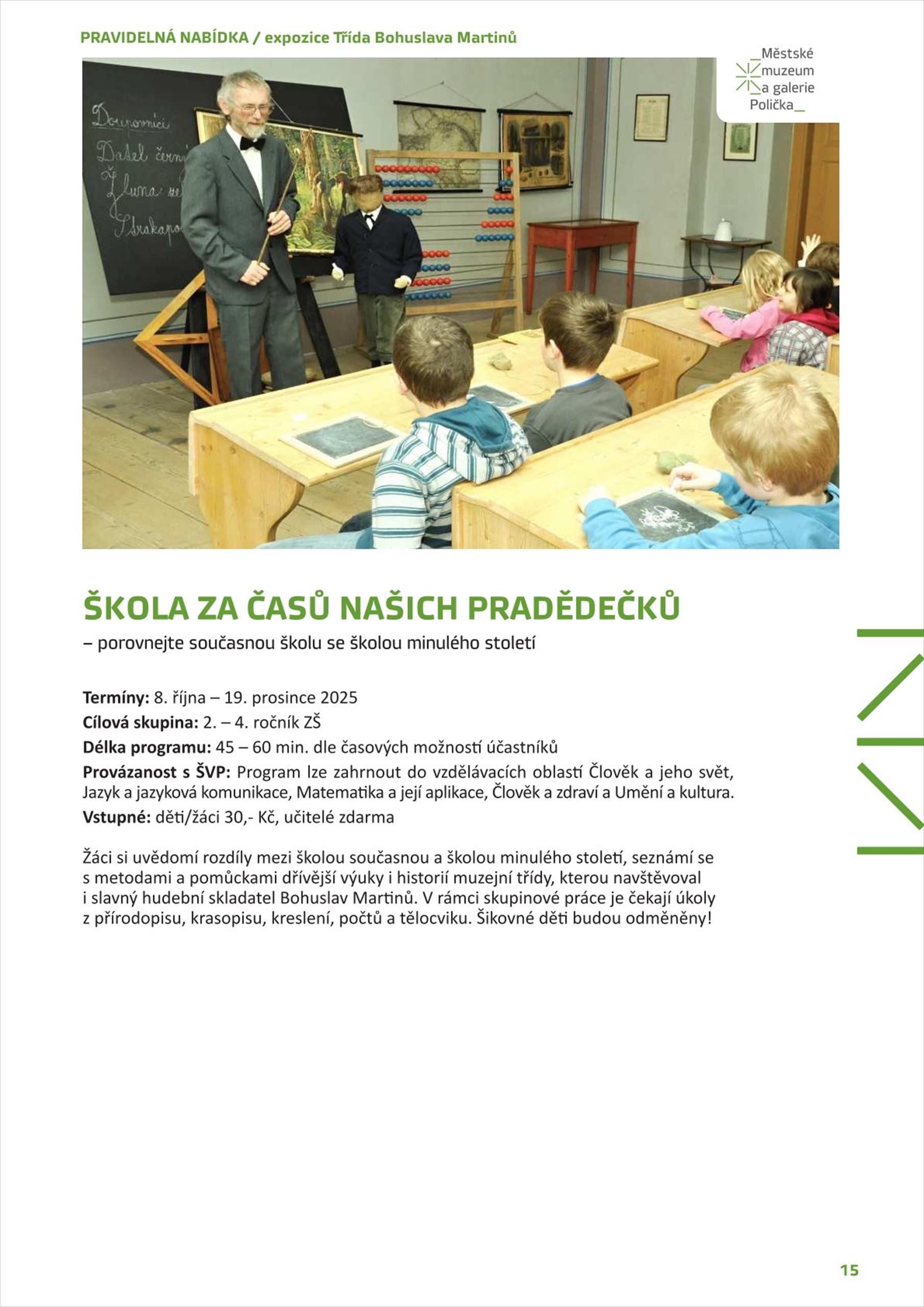 Muzeum představilo svoji pololetní nabídku vzdělávacích programů pro školy a školky a už se moc těší na malé i větší návštěvníky. Největší zájem je o podzimní výstavu KELTOVÉ. Naše dávná minulost a vánoční výstavu ANDĚLÉ. Připravované programy jsou vždy přizpůsobené věku a úrovni dětí, žáků a studentů, jsou doplněné aktivitami, skupinovou prací i výtvarnými a tvořivými koutky. Mezi dětmi je oblíbená závěrečná část programu, kdy si mohou užít a prozkoumat výstavu samy a vyzkoušet si všechny interaktivní prvky a připravené aktivity a hry.