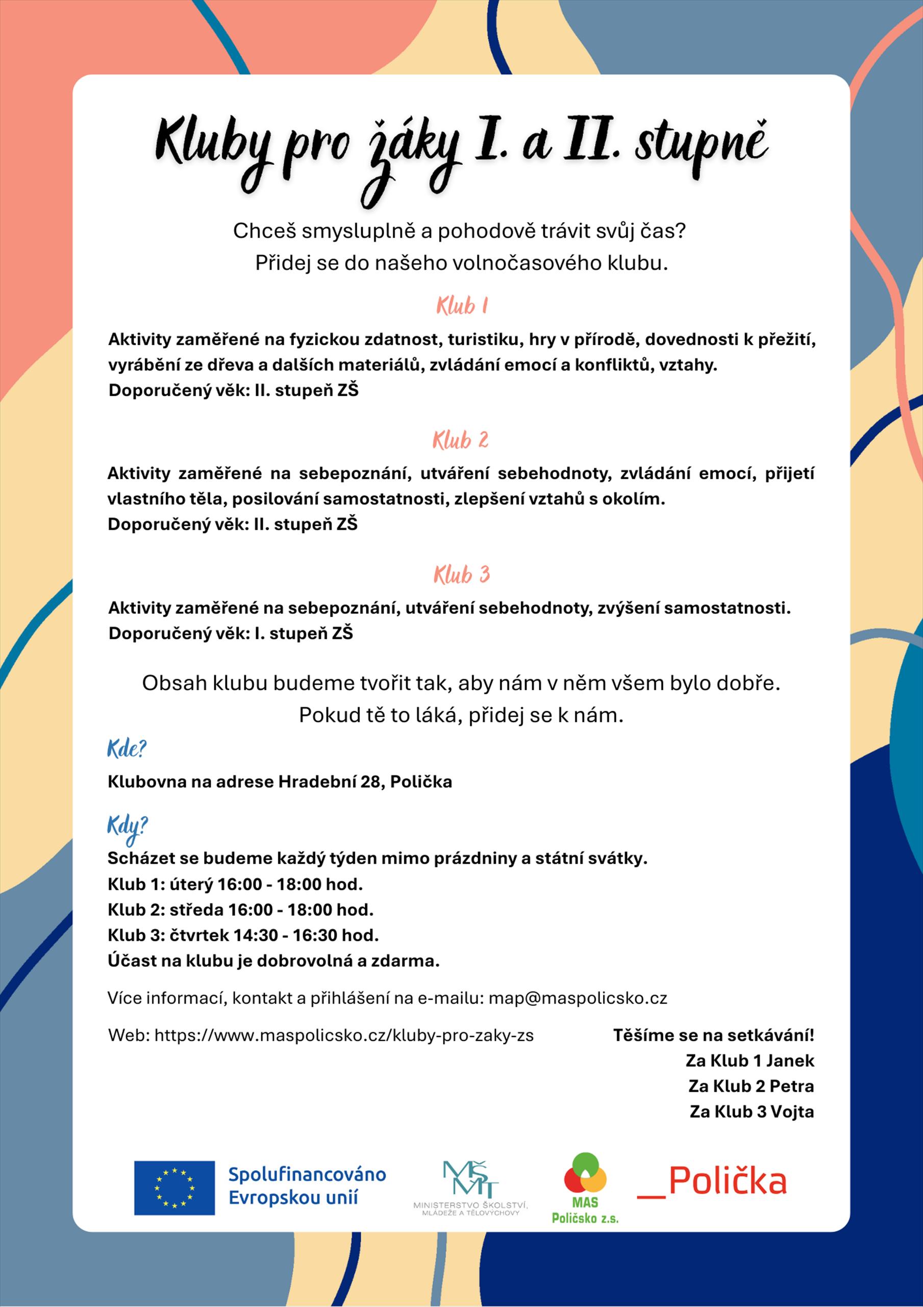 Více informací o provozu klubů, včetně rozpisu termínů a možnosti přihlášení, naleznete na webových stránkách MAS Poličsko: https://www.maspolicsko.cz/kluby-pro-zaky-zs