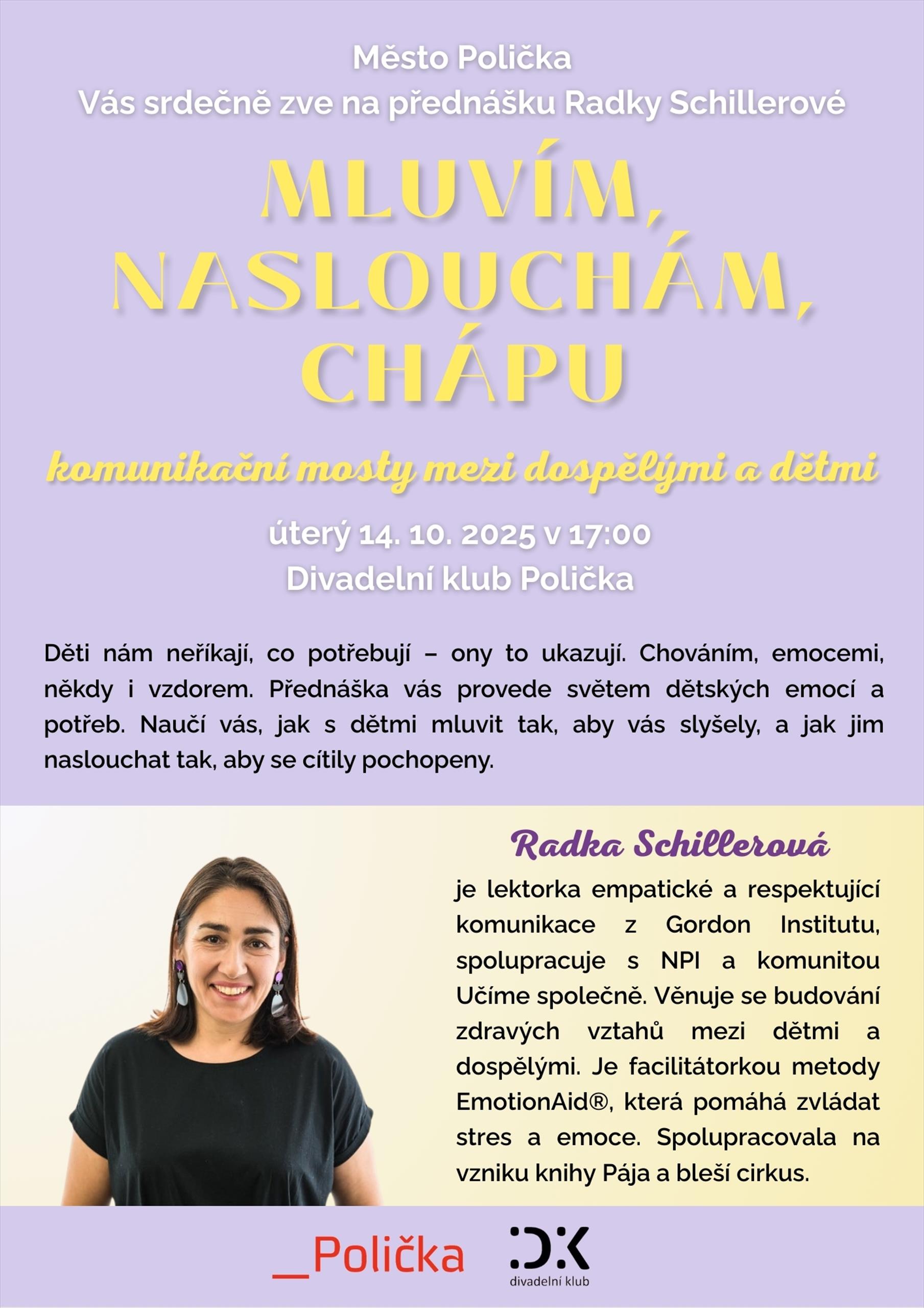 Město Polička srdečně zve na přednášku Radky Schillerové Mluvím, naslouchám, chápu: komunikační mosty mezi dospělými a dětmi, která se bude konat v úterý 14. 10. 2025 v 17:00 v Divadelním klubu v Poličce.