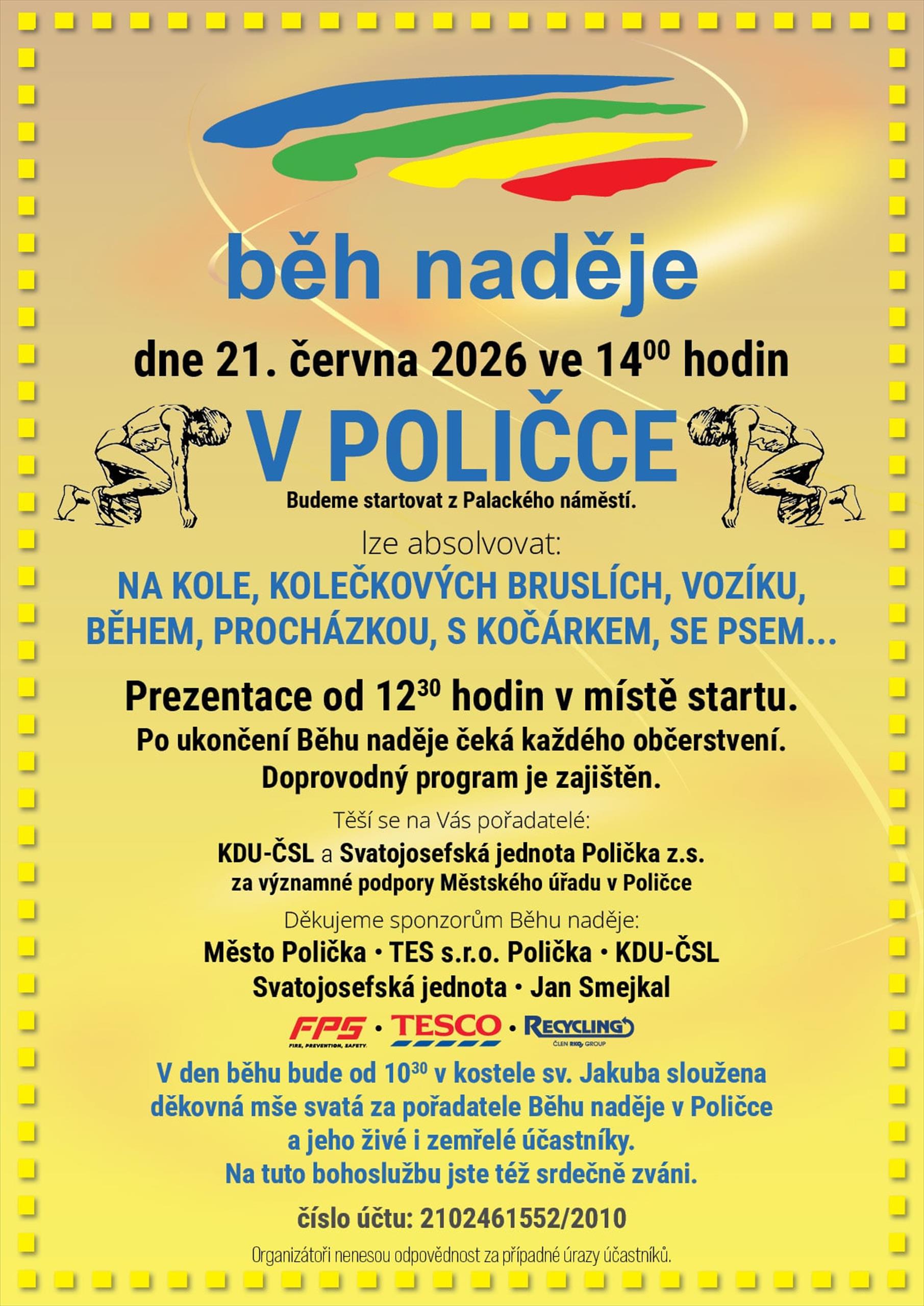 Mé poděkování patří vám, kteří nás podpoříte. Cením si práce spolupořadatelů a podporovatelů z řad MO KDU-ČSL v Poličce, Svatojosefské jednoty Polička i města Polička, které je dlouholetým podporovatelem i příznivcem zároveň. Nechci zapomenout ani na sponzory – Město Polička, firmu FPS, Jana Smejkala, Tesco a firmu Recykling, která se do našeho běhu zapojí poprvé.