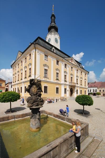 Na jejím místě byla v letech 1739-44 postavena radnice nová, barokní. Jejím projektantem byl pravděpodobně František Maxmilián Kaňka, který ji navrhl jako monumentální dvoupatrovou budovu palácového typu s mansardovou střechou a věží. Fasády jsou v přízemí členěny pásovou rustikou, přes obě horní patra běží pilastry s kompozitními hlavicemi, na všech čtyřech stranách jsou nízké trojúhelníkové štíty, na nichž byly původně městské znaky (dnes zachován pouze znak nad východním průčelím). Nad okny přízemí a druhého patra jsou reliéfní štukové mušle, nad okny prvého patra jsou pod dynamicky zvlněnými nadokenními římsami v bohatém štukovém dekoru umístěny symetricky řazené individuální busty a masky - busty portrétního a masky karikaturního charakteru (busta v ose východního průčelí údajně zobrazuje tehdejší císařovnu-vdovu Alžbětu Kristinu, jediná zvířecí maska, hlava jelena - v ose západního průčelí - má nepochybně vztah ke štukovému rámu v přízemí, pod nímž do roku 1785 stával pranýř - nad pranýřem umístěný zvonek oznamoval uzavírací hodinu hospod, požární poplach i uvedení provinilce na pranýř). Vchod do radnice je na východní straně, nad vchodem je vysunut malý balkónek. Všechna tři podlaží mají v zásadě stejný půdorys, přízemí je klenuté, patra plochostropá, střed budovy zabírá již zmíněná věž, v severozápadním rohu prostupuje prvé a druhé patro unikátně zachovaná radniční kaple s původní výzdobou z roku 1751, zasvěcená sv. Františku Xaverskému - oltářní obraz (sv. František Xaverský křtí pohany) a nástropní freska (Apoteóza misionářské činnosti sv. Františka Xaverského v Brazílii, Indii a Japonsku). Po stranách oltáře stojí dva jezuitští světci (sv. František Borgiáš a Ignác z Loyoly) od Řehoře Thényho a na stěně ve výklencích visí čtyři obrazy svatých (sv. Václav, sv. Jan Nepomucký, sv. Barbora a sv. Kateřina). Kalvárii na malé tumbě v bočním výklenku vyřezal Jiří František Pacák kolem roku 1730.
