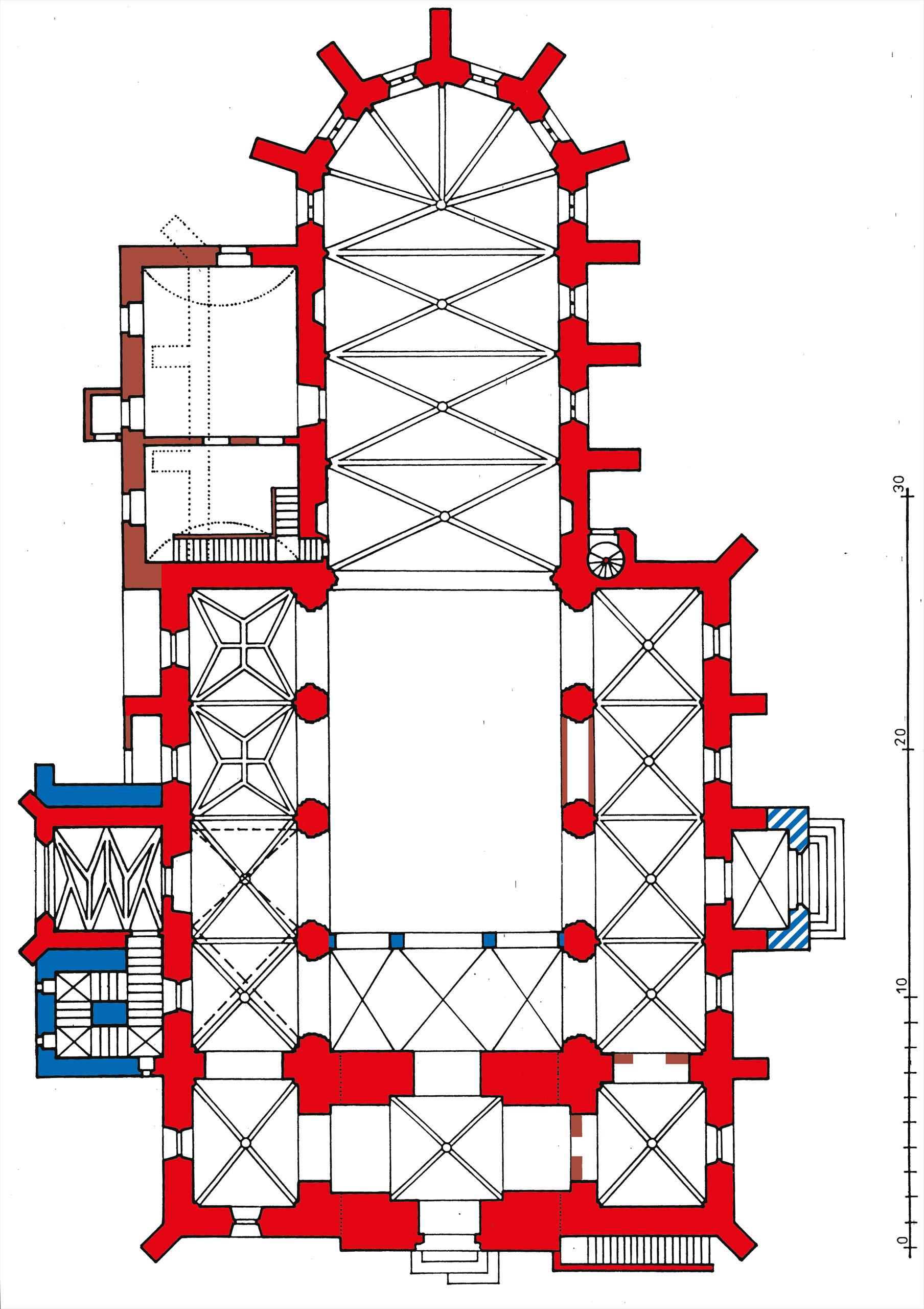 Půdorys kostela v gotickém období (červeně)