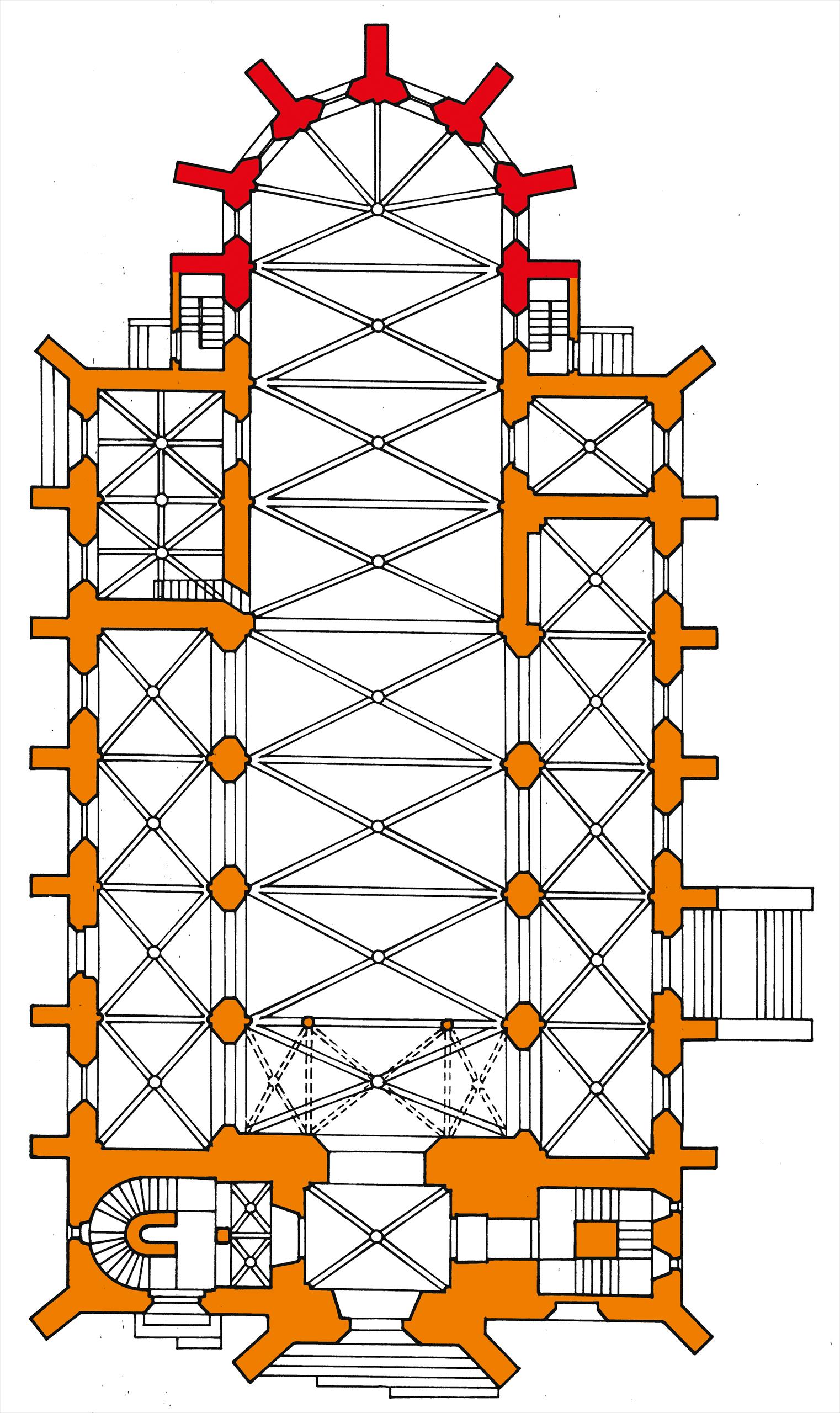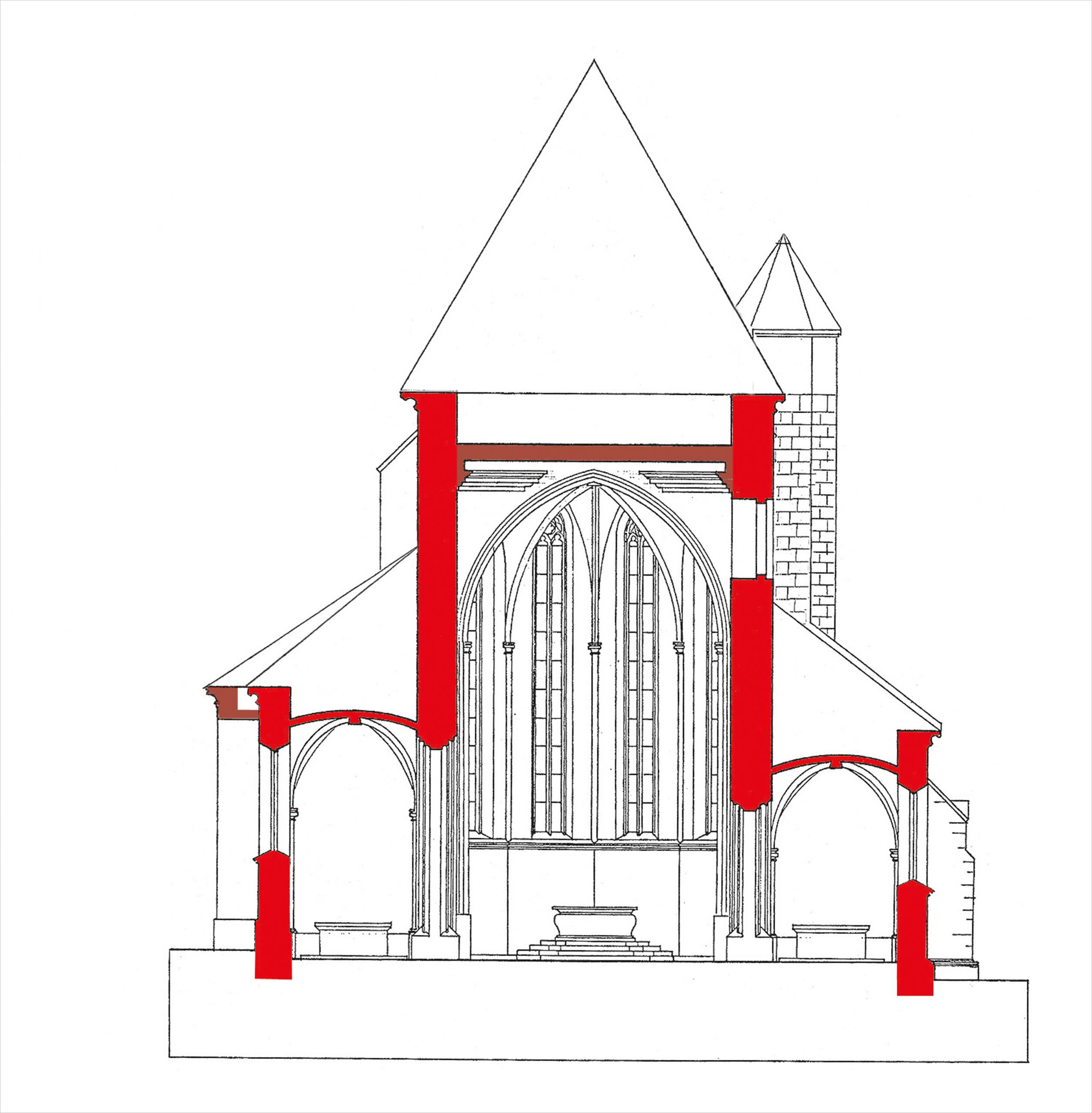 Řez kostelem – gotická bazilika s nižšími bočními loděmi