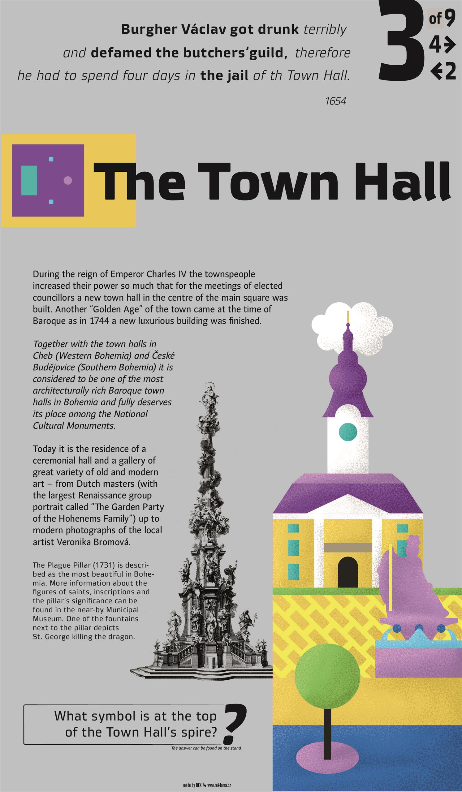 Brief history – The Gothic town hall stood on the square since the Middle Ages, but it ceased to be suitable and in the years 1731 – 1744 it was replaced by a magnificent new building. From the place where you are, you can only see its tower, but definitely do not hesitate and go to the square. There you will also see a unique Plague Pillar.