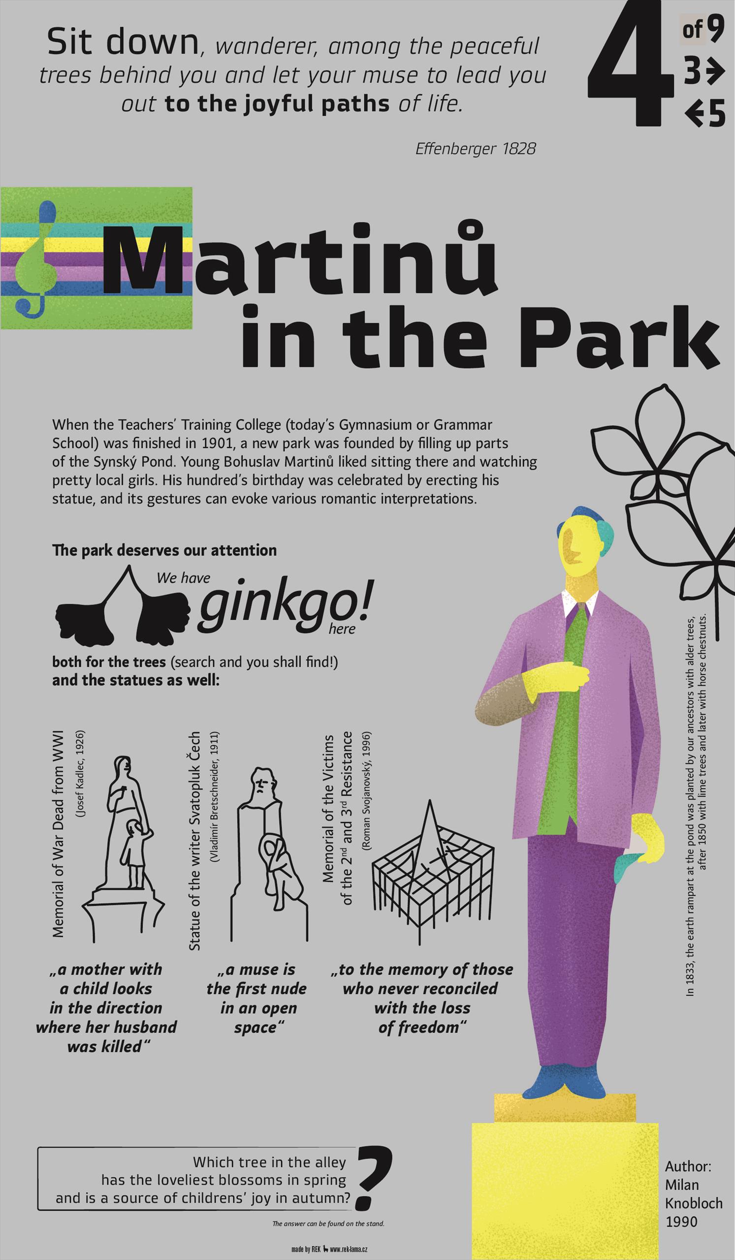 Brief history – The materiál excavated during the construction of the Teacher's Training College was used for filling up the shallow eastern part of the pond. In 1902, the renovation of the park began according to the design of the janitor of the College, who was originally a manor gardener. After 1906, another part of the park was modified and the pavilion of the sport organization Sokol was built. Already in 1901, an iron riveted bridge was built by the Prague Bridge Company – now the bridge is a technical monument (at its beginning from the Grammar School /or Gymnasium/ you can see a cast iron plate with the name of the company). There are several statues in the park that you can easily find.