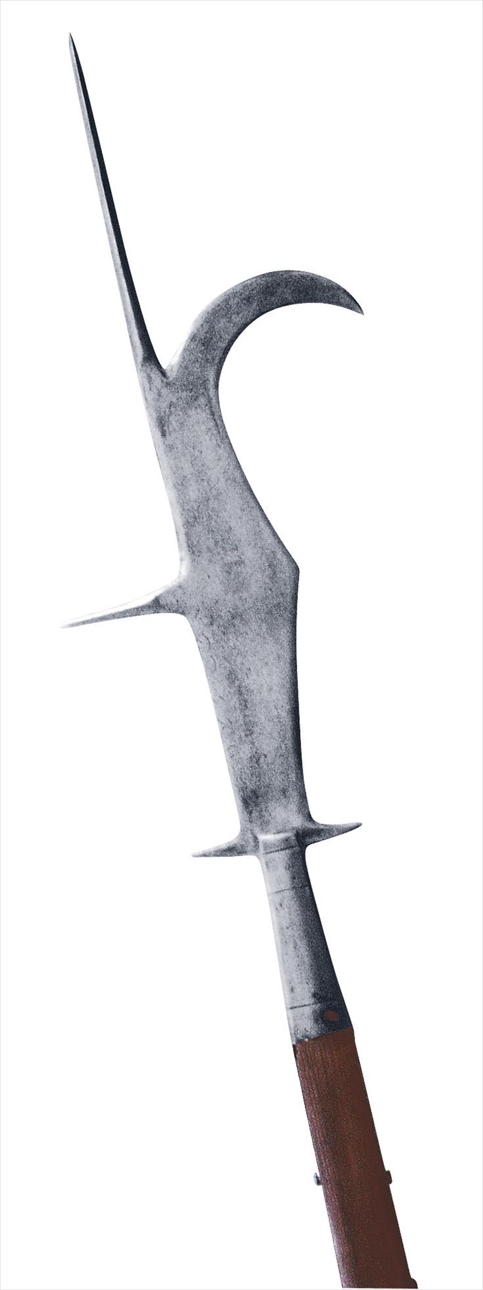 Guisarme – it is depicted in the title header. It is a late medieval infantry weapon that was highly effective in combat with the cavalry. The hook was used for pulling the rider off the horse's neck and then the narow point penetrated the spots between the joints of the plated armour.