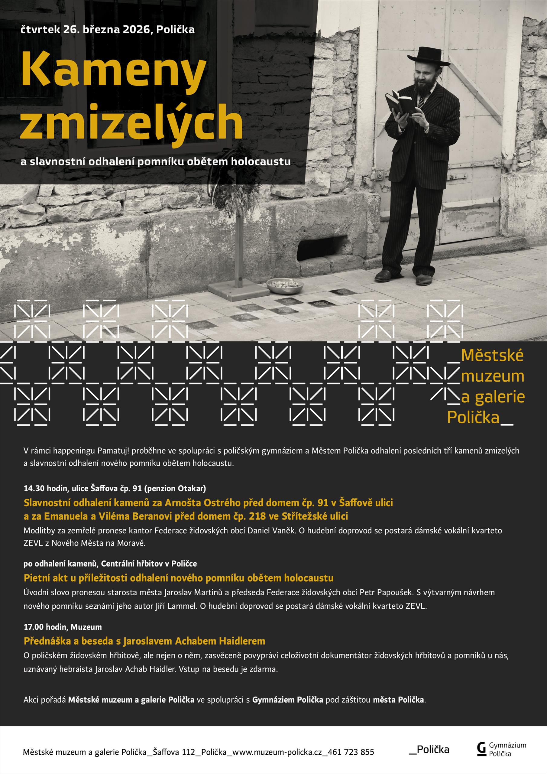 V rámci happeningu Pamatuj! každoročně pořádaného poličským gymnáziem ve spolupráci s Městským muzeem a galerií Polička proběhne pod záštitou města Poličky poslední z pietních aktů odhalení kamenů zmizelých, který bude završen na centrálním hřbitově v Poličce slavnostním odhalením nového pomníku obětem holocaustu.
