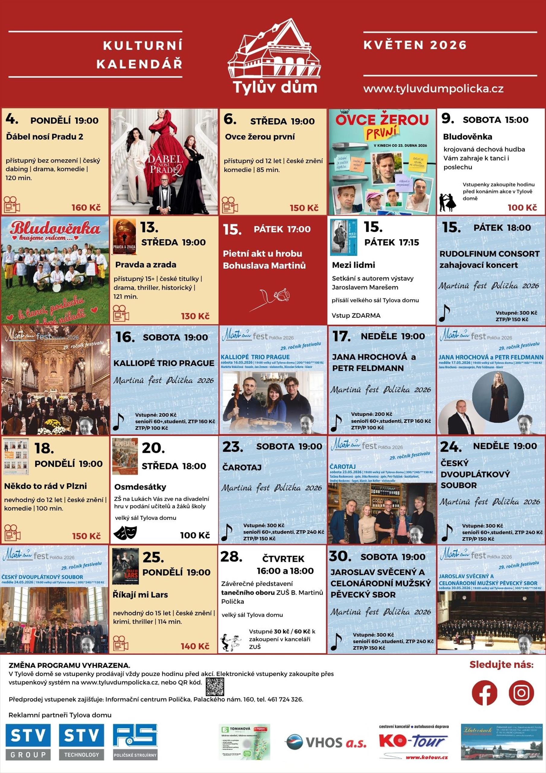 Podstatnou část květnového programu obstará 29. ročník Martinů festivalu Polička. Festival začíná v pátek 15.5. a to hned třemi událostmi. Tradičním zahájením festivalu je pietní akt u hrobu, hudebního skladatele klasické hudby, Bohuslava Martinů na hřbitově sv. Michaela. Následuje zahajovací koncert, který v letošním roce obstará „Rudolfinum Consort“, a v přísálí velkého sálu Tylova domu se budete moci setkat s Jaroslavem Marešem, autorem výstavy „Mezi lidmi“, která se jako červená nit vine Jazz festivalem a Martinů festivalem a ke shlédnutí bude až do 16.6. „Kalliopé trio Prague“, jehož členové jsou laureáty mezinárodních soutěží a mají za sebou řadu sólových i komorních úspěchů se představí 16.5. Na mezzosopranistku Janu Hrochovou a klavíristu Petra Feldmanna se můžete těšit 17.5. „Čarotaj“, ve složení dva ženské hlasy, basklarinet, fagot a violoncello, vystoupí 23.5. Profesionálové, amatéři, žáci, pedagogové a studenti se jako „Český dvouplátkový soubor“ představí 24.5. Festival uzavře 30.5. „Celonárodní mužský pěvecký sbor“ s hlavním hostem a moderátorem koncertu Jaroslavem Svěceným.